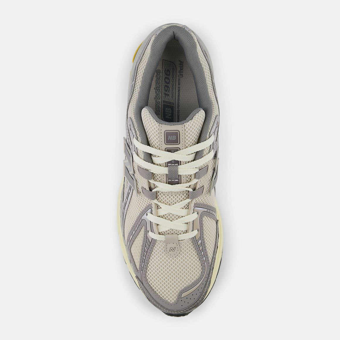 Pour la collection printemps/été 2024, New Balance sort quatre coloris de la 1906 R. La New Balance 1906 R Moonrock Moonbeam présente une empeigne en mesh crème, renforcée par des empiècements en cuir gris et argent. Ils sont visibles sur le garde-boue avant et les panneaux latéraux. Le talon est protégé par une cage en TPU gris clair, assortie au logo N latéral. La paire repose sur une semelle intermédiaire crème, dont l’arrière gris laisse apparaître l’amorti Nergy en jaune.