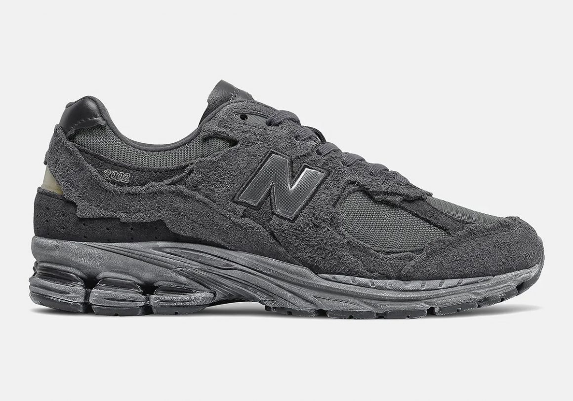 La New Balance 2002R Protection Pack Phantom est la version la plus sombre, la plus dense, presque nocturne du pack. Elle combine un mesh noir délavé à des couches de suède charbon, rehaussées de nuances anthracite et de reflets très légèrement bleutés dans certaines lumières. Ce coloris donne une puissance particulière à la construction effilochée, les ombres créées par les superpositions de matières renforcent l’effet de profondeur, donnant l’impression d’un objet sculpté plutôt que fabriqué. C’est la version la plus radicale, la plus affirmée, et sans doute la plus versatile pour ceux qui cherchent à allier discrétion et complexité formelle. Le rendu final évoque le métal oxydé, le bitume mouillé, ou encore les surfaces urbaines marquées par le temps.