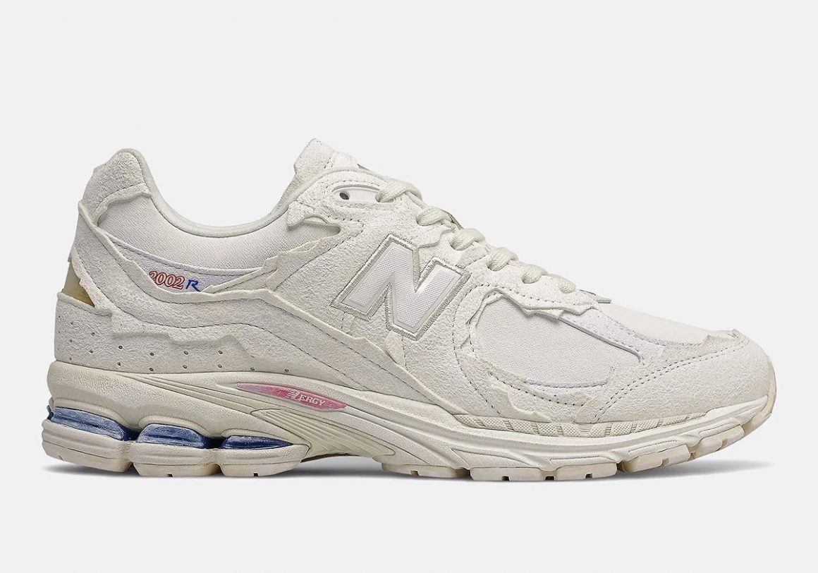 La New Balance 2002R Protection Pack Sea Salt offre une lecture plus lumineuse et plus apaisée de la silhouette. Ici, les tons oscillent entre blanc cassé, ivoire et sable pâle, pour un rendu à la fois doux et texturé. Le mesh crème, légèrement translucide, laisse apparaître des jeux de lumière subtils, tandis que les pièces de suède déchirées arborent une teinte coquille d’œuf à la surface irrégulière. Ce coloris donne à la chaussure un caractère presque minéral, comme une roche polie par les vagues. C’est la version la plus estivale, la plus fluide, celle qui s’intègre aussi bien dans un paysage côtier que dans une silhouette urbaine minimaliste. Le contraste entre la complexité de la construction et la sérénité des tons renforce l’impact visuel de la paire sans jamais verser dans la surenchère.