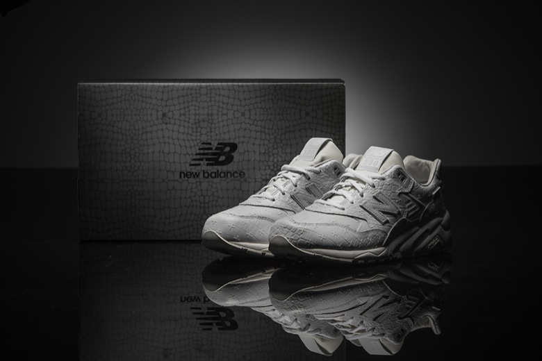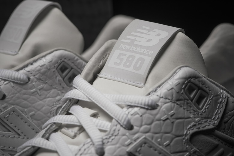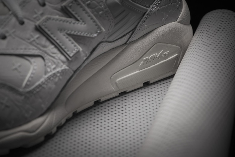 Cette fois-ci c’est la New Balance 580 dans sa version la plus récente, REVlite (semelle intermédiaire bien plus légère) qui est déclinée de cette façon. La paire est en cuir frappé avec, à la fois, un rendu façon croc-skin (peau de crocodile) et un monogramme avec des croix. Quelques empiècements ont été traités afin d’avoir un rendu réfléchissant (type 3M) : la languette, le logo N et les fameuses petites croix.