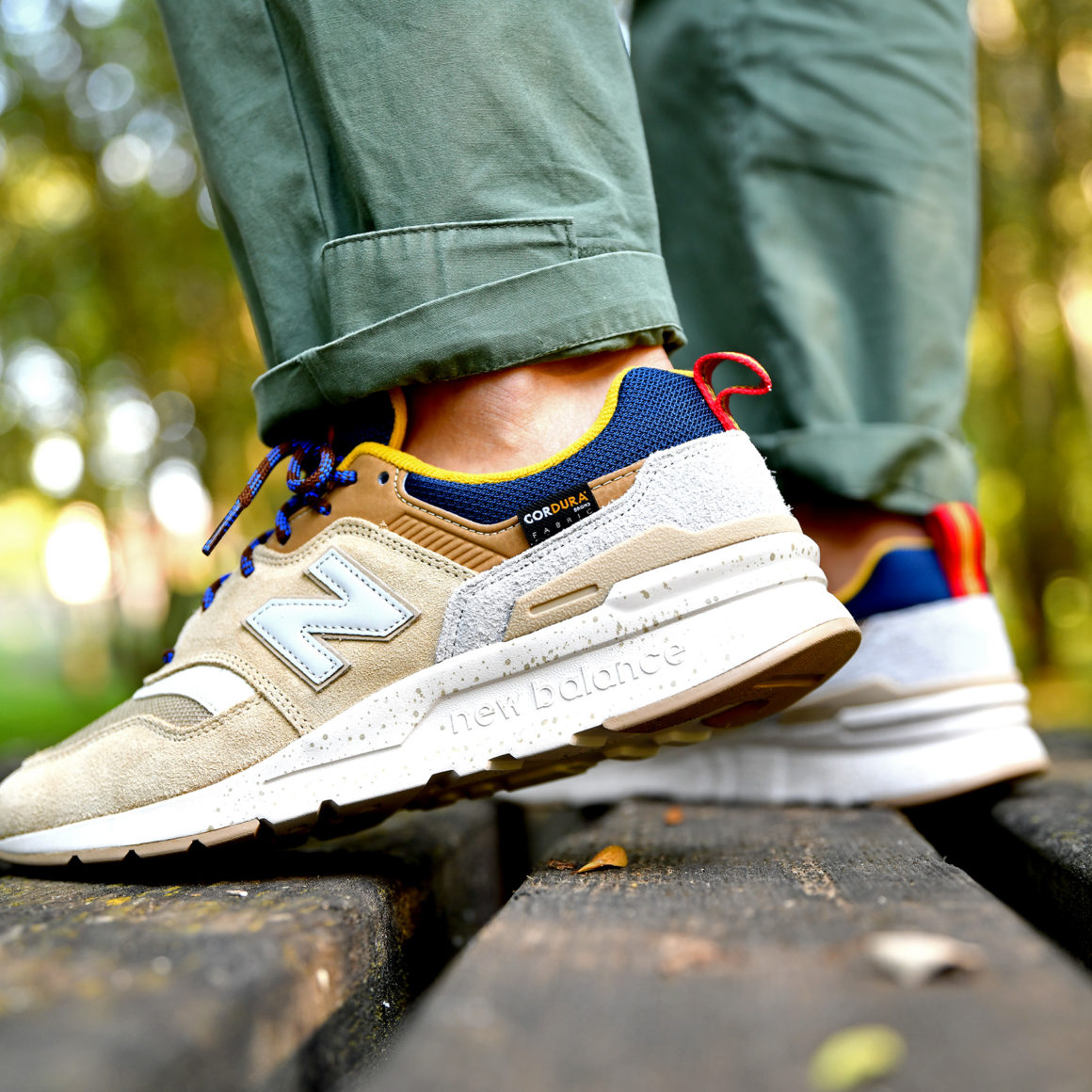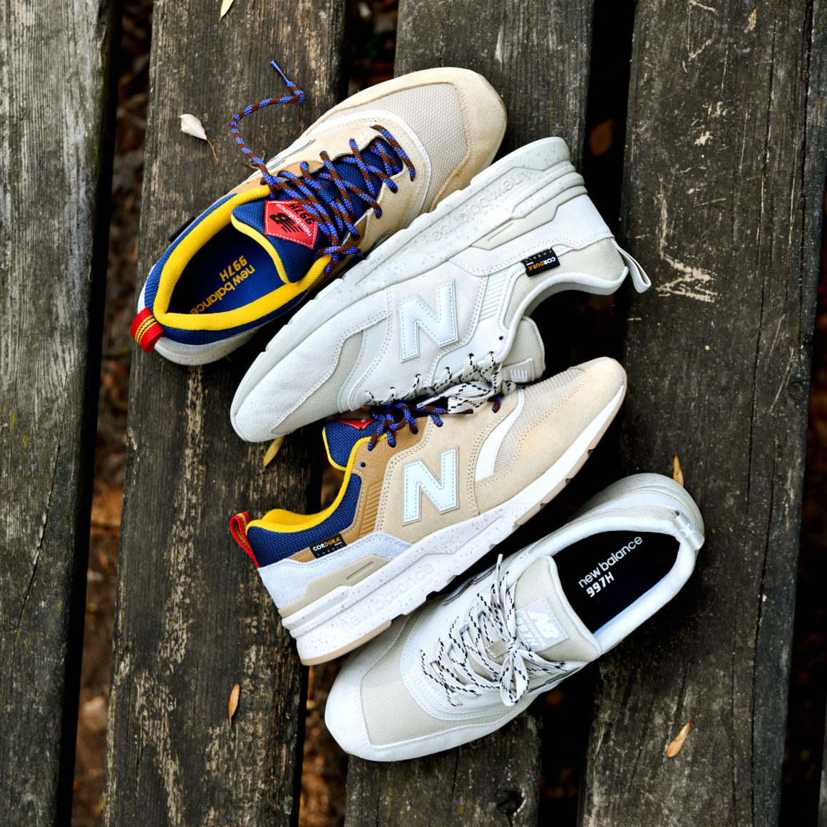 La première paire, nommée New Balance CM997 HFA, dispose d’un upper assez coloré avec du bleu marine, du jaune, du rouge, ainsi que différentes teintes de beige. Ce coloris s’inspire des silhouettes de trail et on retrouve d’ailleurs des lacets ronds souvent utilisés sur les chaussures de montagne. En ce qui concerne la construction de la paire, la tige est constituée de plusieurs matériaux dont du Cordura sur la toebox, du daim plutôt lisse sur l’avant de la chaussure et du hairy suède au niveau du talon. Le logo New Balance est de couleur blanc cassé. L’empeigne repose sur une semelle blanc cassé et moucheté de beige. Cette semelle diffère de la New Balance 997 traditionnelle car elle est plus légère. Enfin, l’étiquette Cordura figure sur le profil extérieur de la paire.