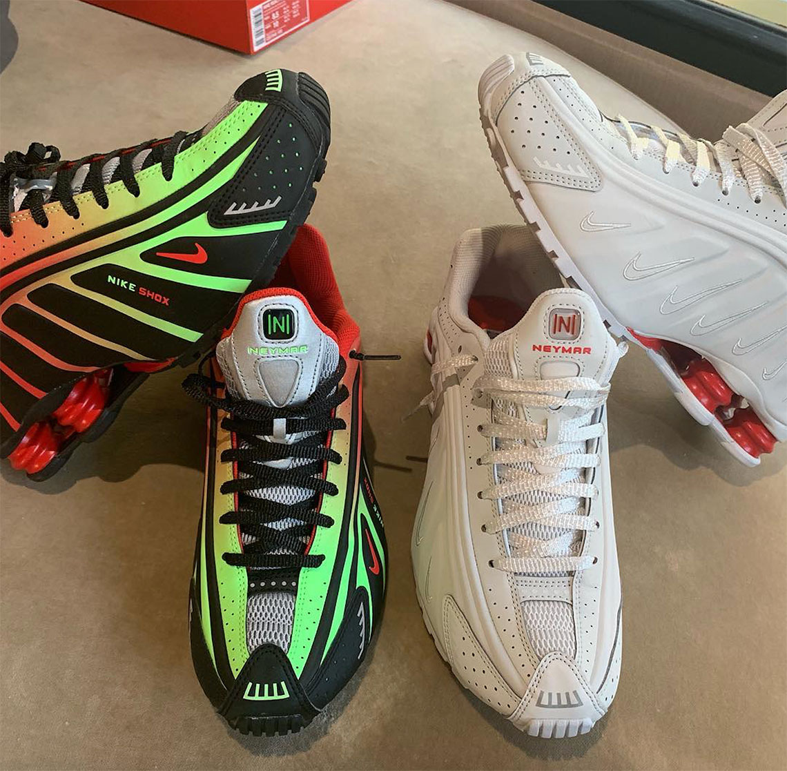 Ce sont deux versions de la Shox R4 qui ont été développées jusqu’à présent selon les premiers éléments ayant fuité sur internet. La première est plutôt sobre et revêt un code couleur blanc complété par les célèbres ressorts rouges. Un look overbranded est appliqué et se caractérise par de nombreux Swoosh sur l’empeigne, ton sur ton. Le joueur brésilien a d’ores et déjà été aperçu avec un autre coloris à ses pieds. Sa base noire est agrémentée par un coloris dégradé allant du rouge vif au vert fluo, certainement un clin d’œil à l’identité brésilienne. Le nom de Neymar apparaît sur la languette des deux modèles, aux côtés d’un logo Nike Shox pivoté, une première sur ce modèle. De nombreux éléments en 3M sont apposés directement sur l’empeigne tout comme les sorties originales.
