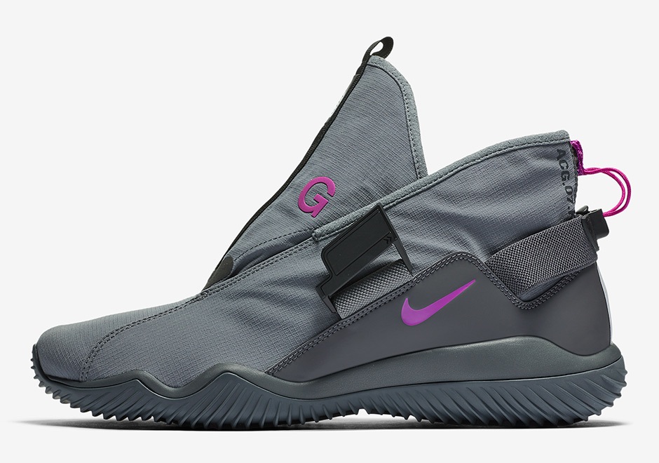 Ce nouveau lancement colle parfaitement à l’ADN de Nike ACG puisque ces deux paires arborent des couleurs typiques de la gamme outdoor. La collection se compose d’une version grise et violette et d’une seconde marron avec des détails orange. Sa construction, imaginée entre autres par Errolson Hugh (Acronym), reste la même avec son système de languette rétractable par le biais d’un cordon au talon ou encore de son strap disposant d’une boucle magnétique. La toile en ripstop présente un traitement imperméable afin de pouvoir porter la paire sous toutes les conditions.
