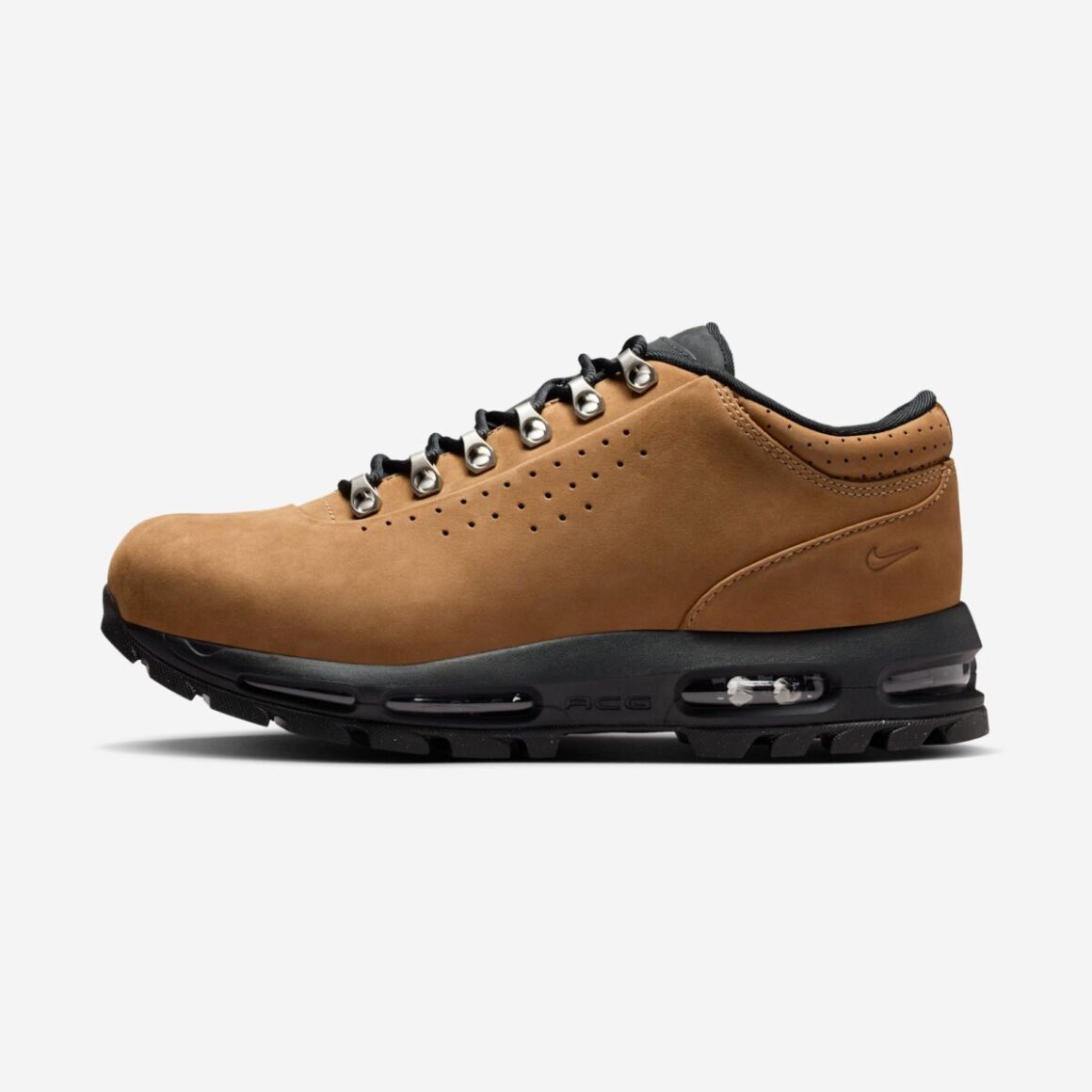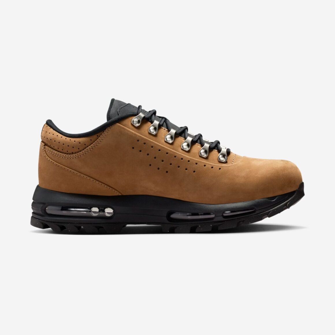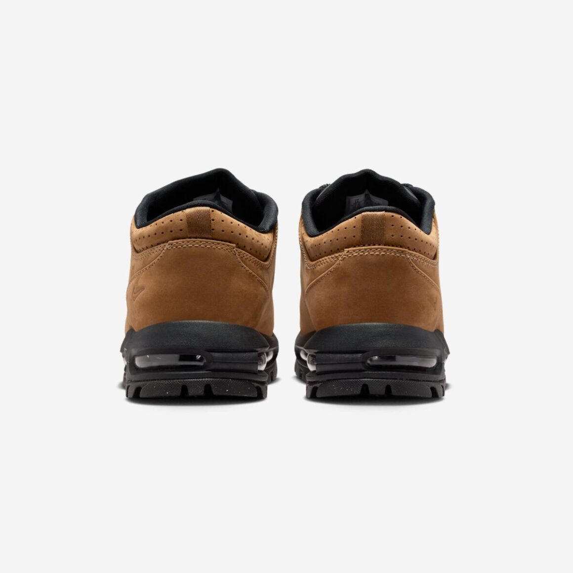 Les zones périphériques de la paire, telles que les œillets métalliques, les renforts du col de cheville perforés et la tirette au talon, reprennent le taupe principal tout en offrant des variations subtiles de texture. L’usage de matières légèrement texturées, comme du textile pour la tirette, enrichit la lecture visuelle de la sneaker sans la rendre trop disparate. Ces choix matérialisent une cohésion visuelle qui mise sur l’équilibre. Pour en faire une sneaker outdoor à part entière, la firme de Beaverton assoit cette Air Max Goadome sur une semelle extérieure noire robuste, finalisant un design idéal pour les sentiers et les pavés urbains.
