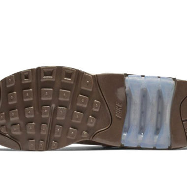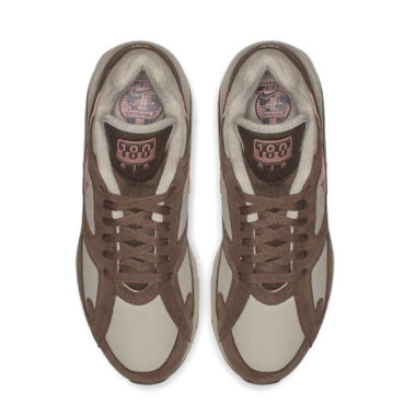Cette toute nouvelle paire rappelle en effet un modèle emblématique sorti au milieu des années 2000, l’Air 180 « Nom de Guerre ». Cette dernière est souvent considérée comme un graal inatteignable pour de nombreux amateurs de sneakers : les rumeurs laissent penser que moins de 100 exemplaires avaient été créés pour cette collaboration, en marge du lancement du programme NikeID appliqué à cette paire à bulle d’air. Cette nouveauté Nike s’inspire de cette sneaker et de son coloris à l’esthéthique militaire, l’ADN même des produits de Nom de Guerre. La combinaison de couleurs appliquée à cette chaussure varie ainsi entre le marron dit « Baroque Brown », une teinte marron clair appelée « String » et enfin un rose foncé. Comme à l’époque, une robe suédée habille l’empeigne à tige basse. Plusieurs différences notables différencient cette paire de son homonyme sorti en 2005 et sont visibles par un jeu d’échange du placement de couleurs. Auparavant bleu, le Swoosh adopte ici la teinte Rust Pink rappelée sur le branding au talon et sur la languette via le logo Air 180. Le bleu n’est pas pour autant absent de cette déclinaison inédite. Il caractérise la bulle d’air apparente pour se rapprocher au plus près de la paire originelle.