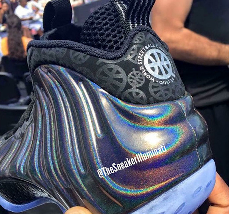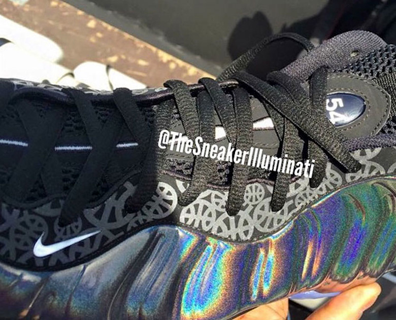 La paire dispose d’un imprimé en all-over présent sur tout l’empiècement proche des passants de lacets ainsi que d’un revêtement iridescent appliqué sur la coque en plastique, caractéristique de la série Nike Foamposite, qui enveloppe l’ensemble de la sneaker.