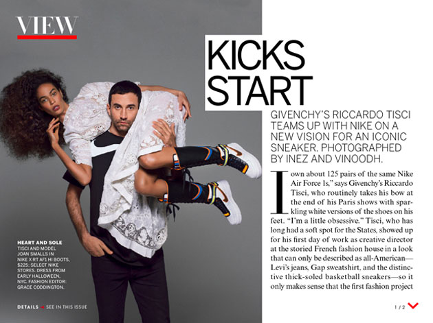 On vous avait parlé de l’association à venir entre Nike et le designer Riccardo Tisci. Ce dernier semble être un amateur de Nike Air Force 1 et déclare en avoir plus d’une centaine. Il parait donc peu surprenant de voir que la première paire dévoilée est une Nike Air Force 1 Hi. On ne distingue pas forcément bien les détails de la paire sur l’image du magazine Vogue.