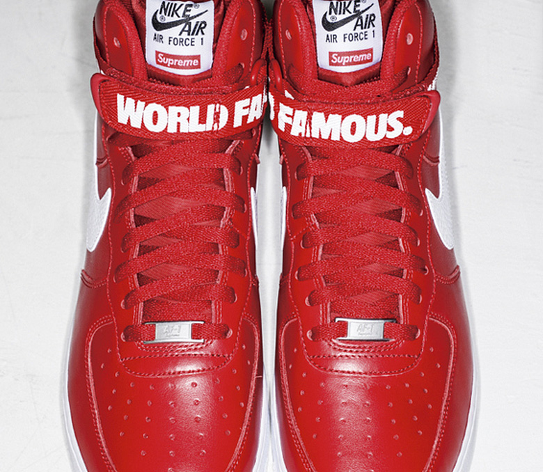 On avait donc d’abord aperçu les deux coloris noir et blanc sur divers réseaux sociaux. C’est avec la sortie du nouveau numéro du magazine japonais Shoes Master, qui est d’ailleurs souvent la première source des futures sorties en édition limitée, que l’on a récemment découvert un probable troisième coloris rouge à swoosh blanc. Il paraissait alors logique que Supreme se manifeste rapidement afin d’annoncer quand et comment sortiront ces trois paires de Nike Air Force 1 Hi. Force est de constater que la Nike AF1 dans sa version haute est de retour dans les collections avec notamment une série pour Liberty et d’autres sorties Quickstrikes à venir. Même des marques de luxe s’y mettent avec une version chez Céline.