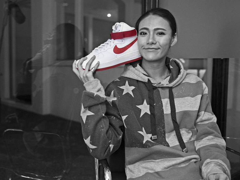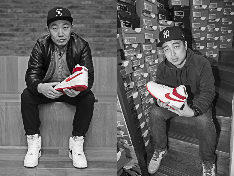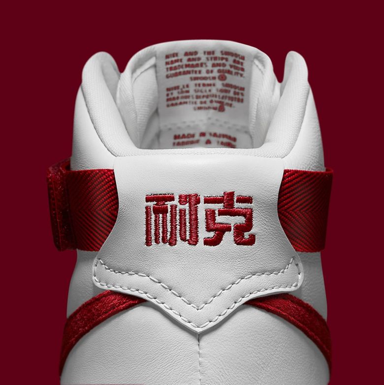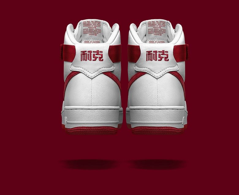 Cette sneaker est faite de cuir blanc associé à des touches de rouge, une couleur qui tient son importance en Chine. On trouve l’inscription « 耐 克 » sur les talons de chaque Air Force 1. Ces deux symboles se traduisent par Nai Ke, l’écriture phonétique pour Nike.
