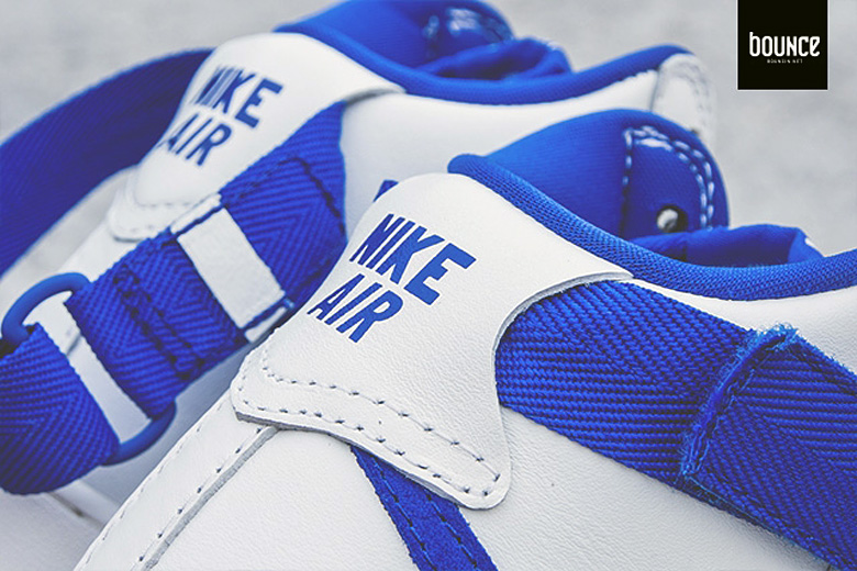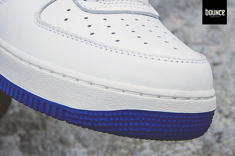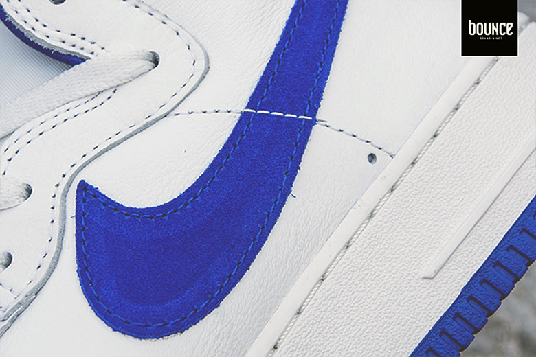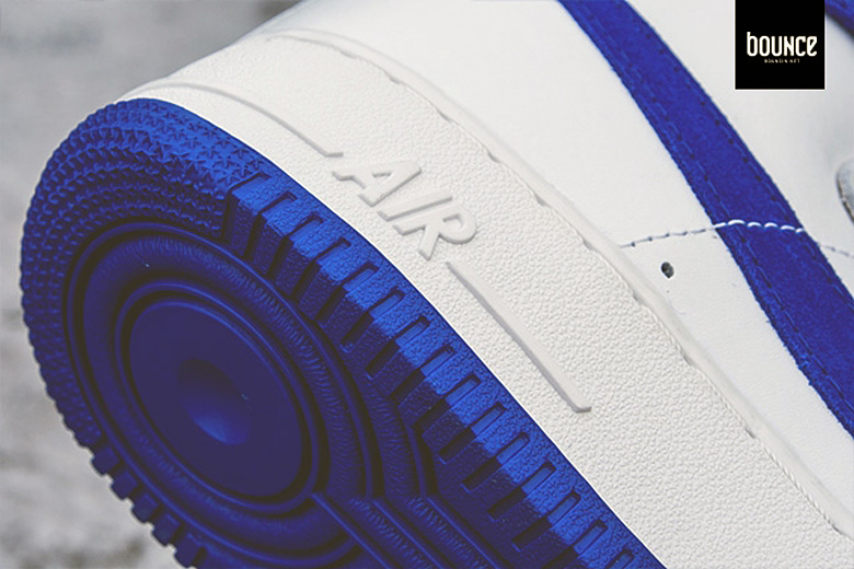 Comme sur les précédentes séries, on retrouve sur cette sneaker un Swoosh avec une forme légèrement différente que sur les Air Force 1 plus récentes. Celui-ci sera d’ailleurs en cuir suédé bleu roi, couleur que l’on retrouvera à différents endroits sur la paire.