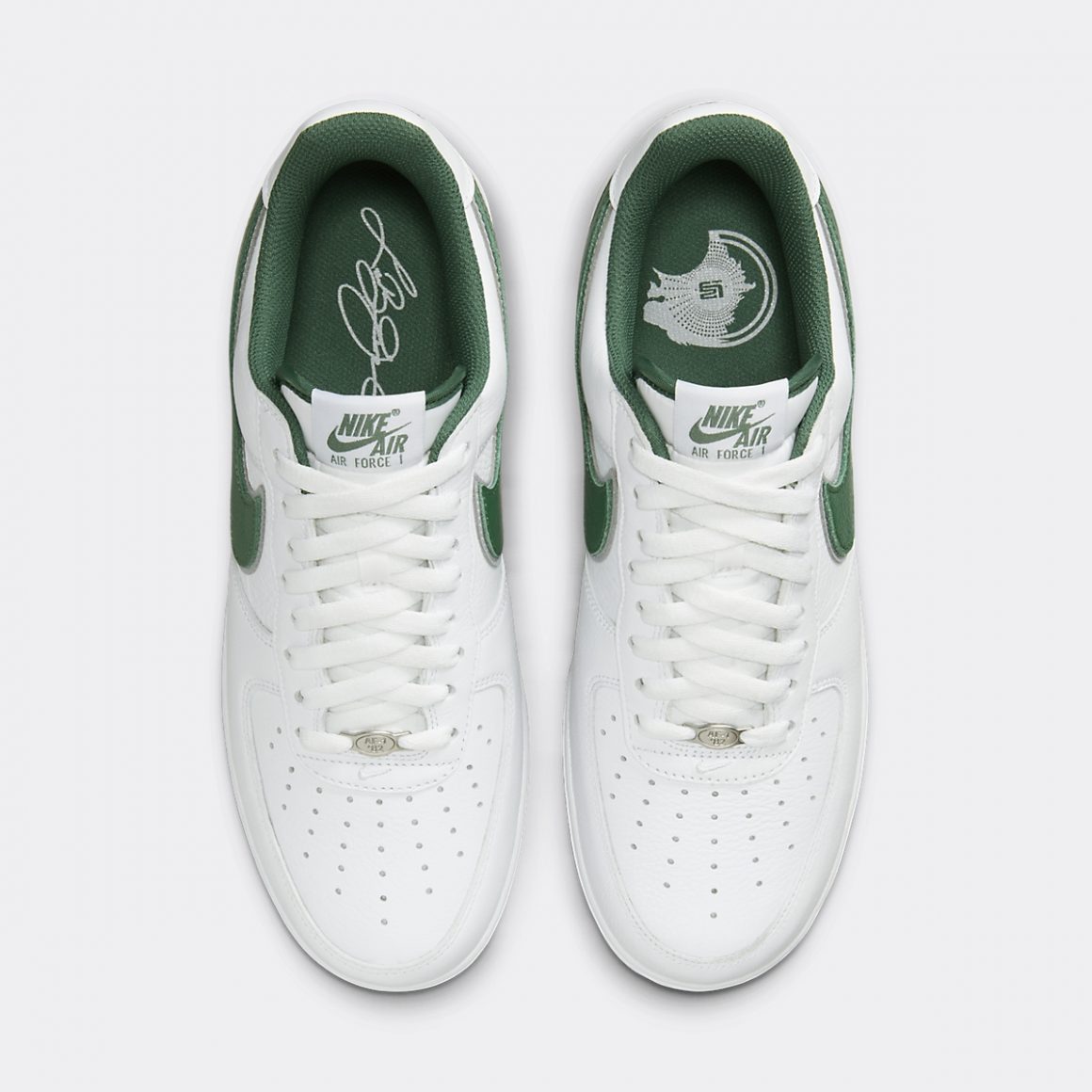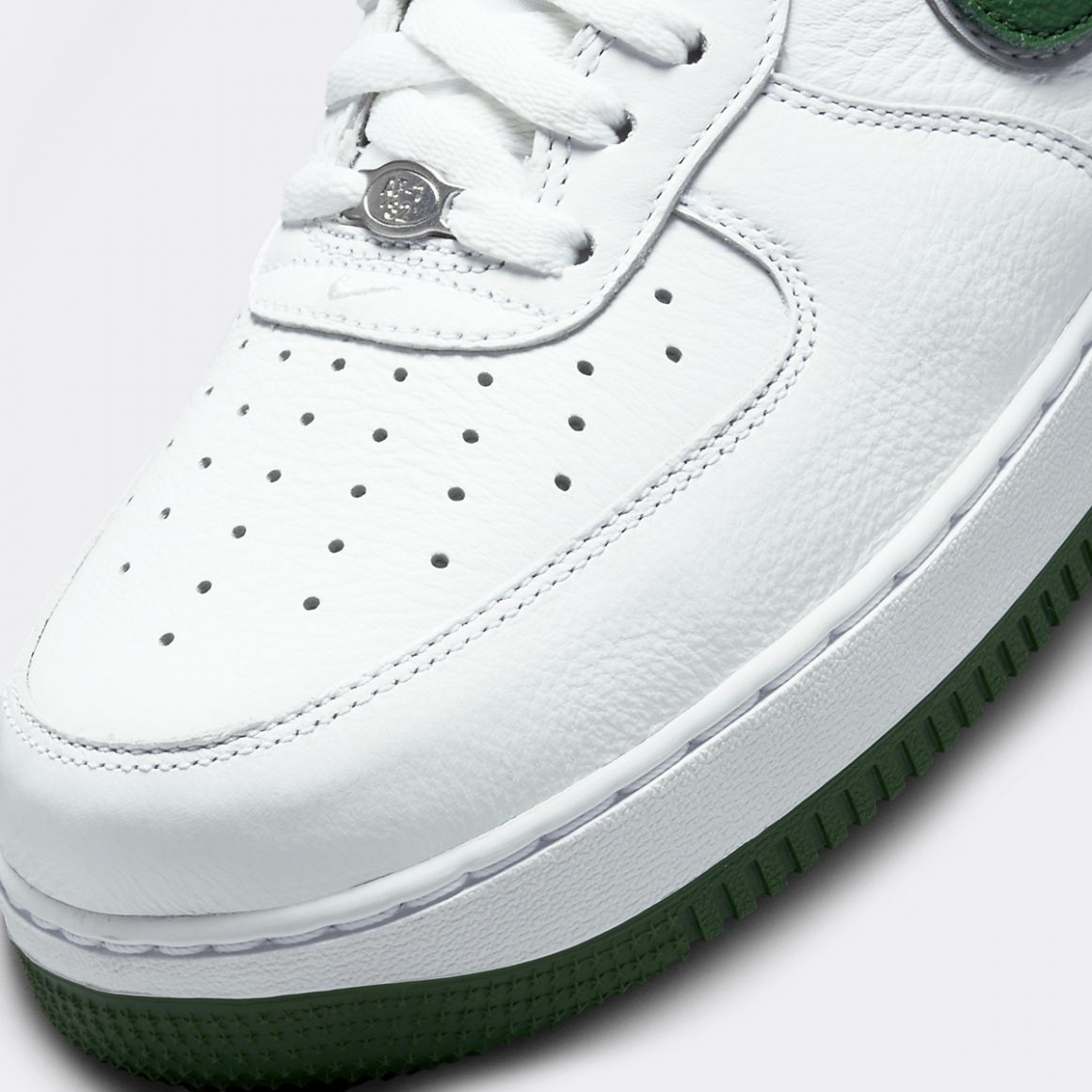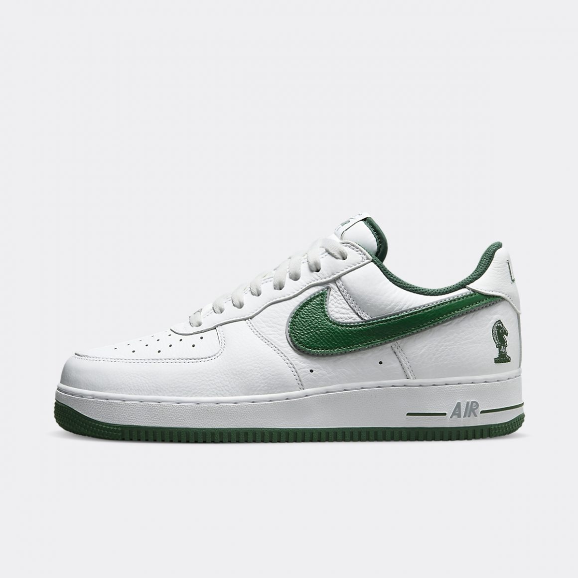 La Nike Air Force 1 Low Four Horsemen LeBron reprend la silhouette basse du classique de Bruce Kilgore, et l’habille des couleurs du lycée St. Vincent–St. Mary. La tige immaculée est construite en cuir, à l’instar du Swoosh latéral. Ce dernier se pare de vert forêt, liseré d’argent. Ce vert habille également le sockliner, et le liseré de la languette blanche. Elle est surmontée d’une étiquette au logo Nike Air vert et porte des lacets plats blancs, terminés par un deubré argenté. Le vert et l’argent se retrouvent aussi sur l’inscription Air de la semelle intermédiaire immaculée, surmontant une broderie assortie. En forme de cavalier d’échec, elle symbolise le nom que s’est donné le groupe d’amis. Pour marquer de leurs noms la paire, les initiales LRMR des quatre compagnons sont brodées sur le heeltab.