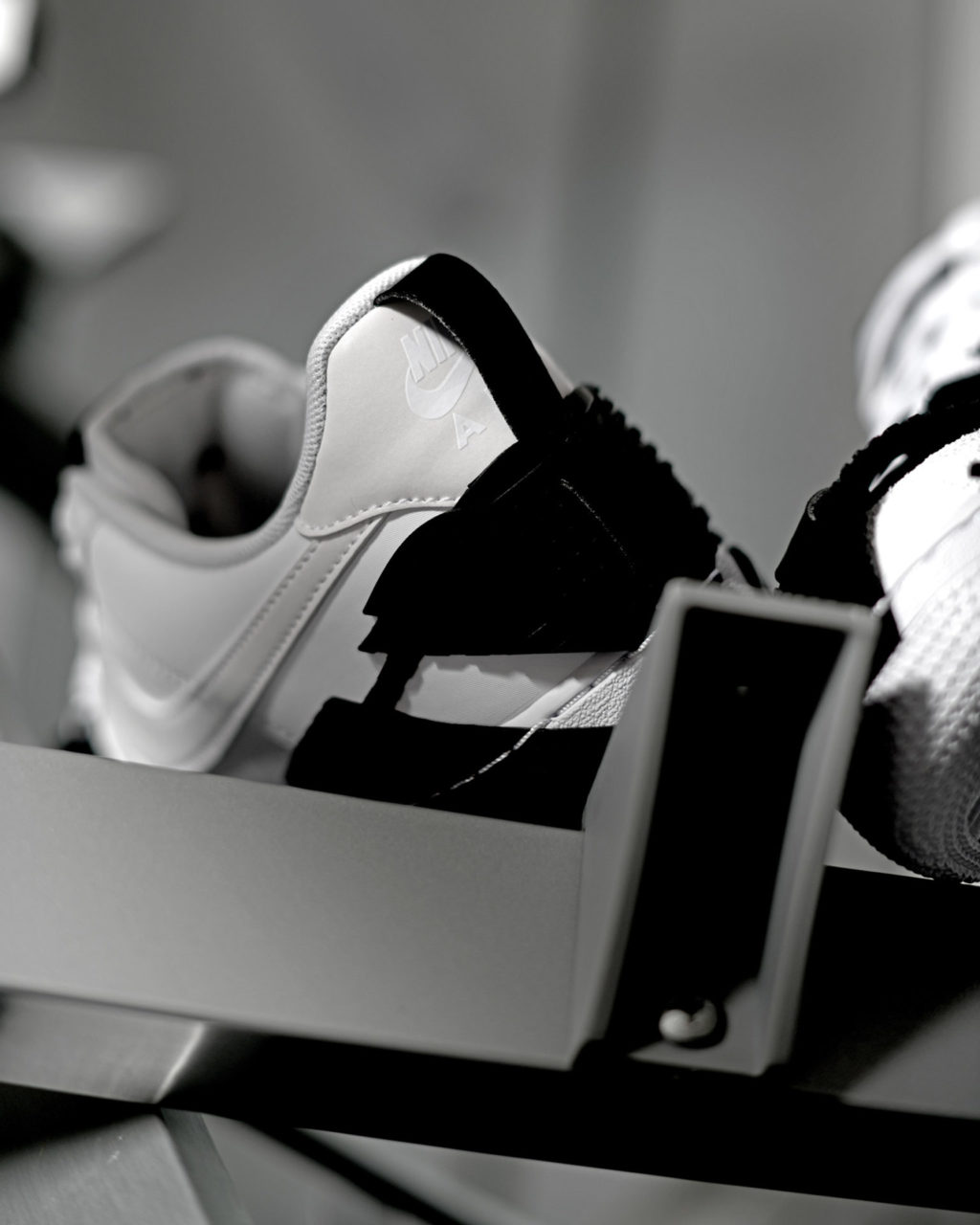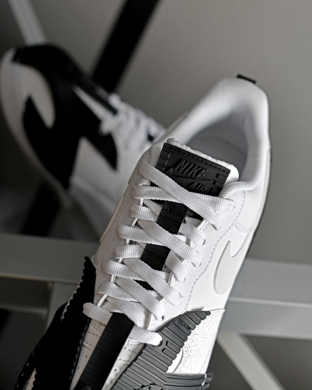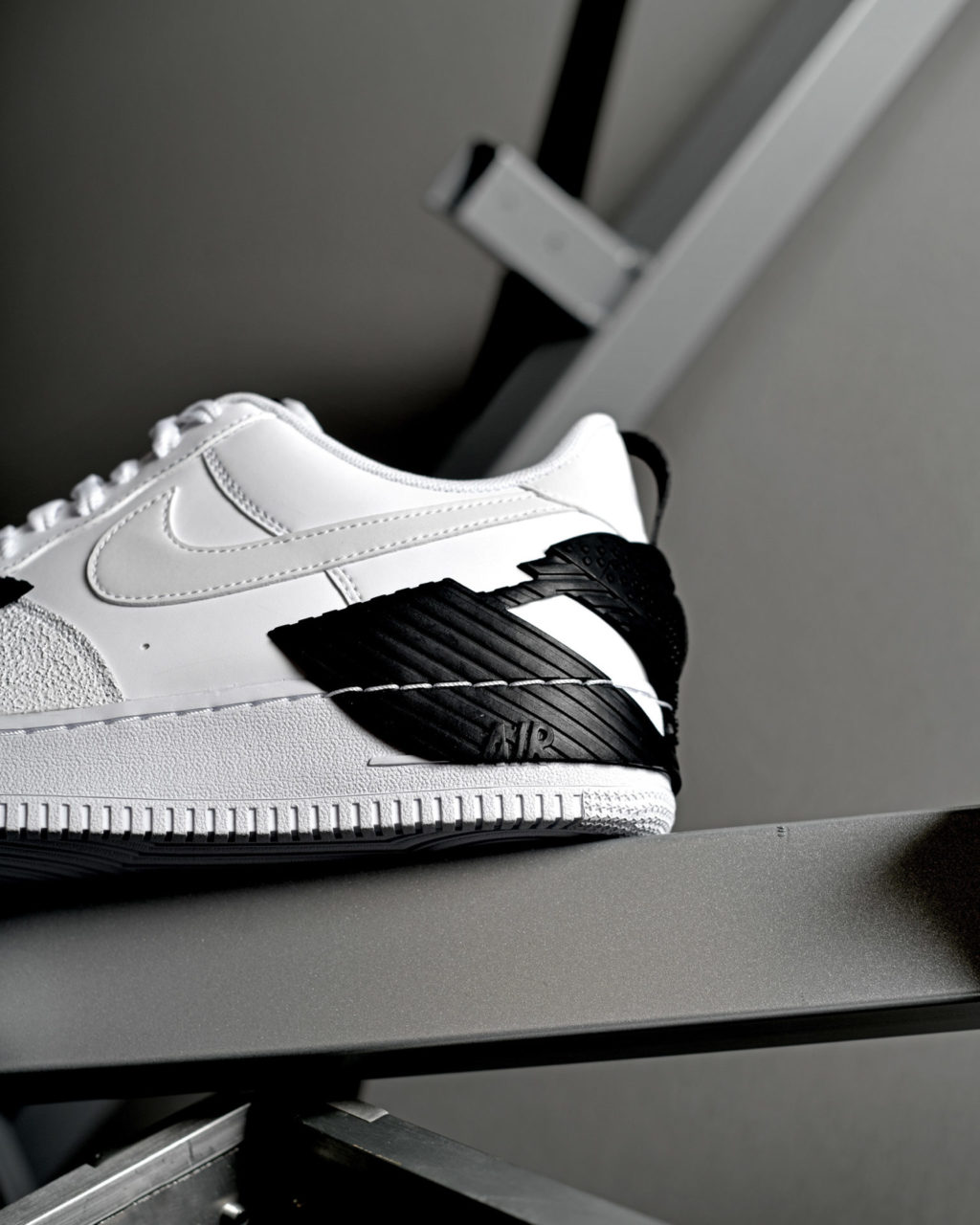 On retrouve ici une version blanche de l’iconique silhouette de la firme de l’Oregon. Le cuir lisse utilisé ne contraste qu’avec du cuir suédé immaculé sur le garde-boue avant. Ce qui rend cette Air Force 1 si particulière est l’ajout d’empiècements en caoutchouc noir directement sur la tige. Leur découpage déstructuré et le matériau utilisé rappelle les renforcements apportés aux chaussures de sécurité. Un premier empiècement à l’avant est tantôt rayé, tantôt gaufré de points avec l’apparition d’un mini Swoosh. Il relie la toebox et l’étiquette sur la languette par un trait traversant les lacets. Le second est construit de façon similaire et se situe à l’arrière de la paire. Les deux empiècements débordent sur le haut de la semelle intermédiaire pour renforcer le côté déstructuré de la paire.