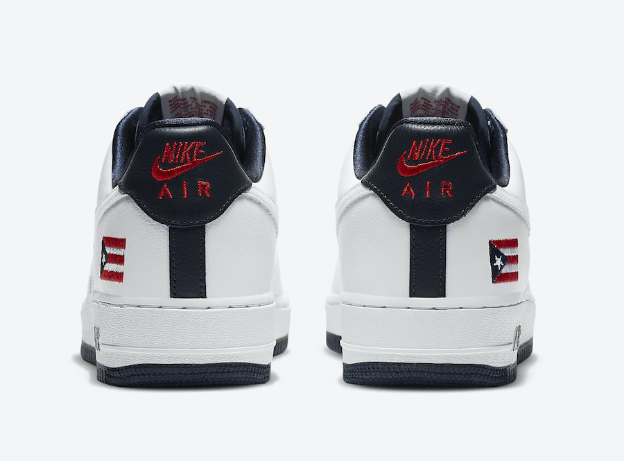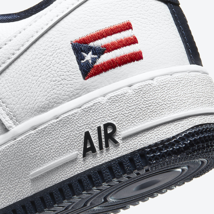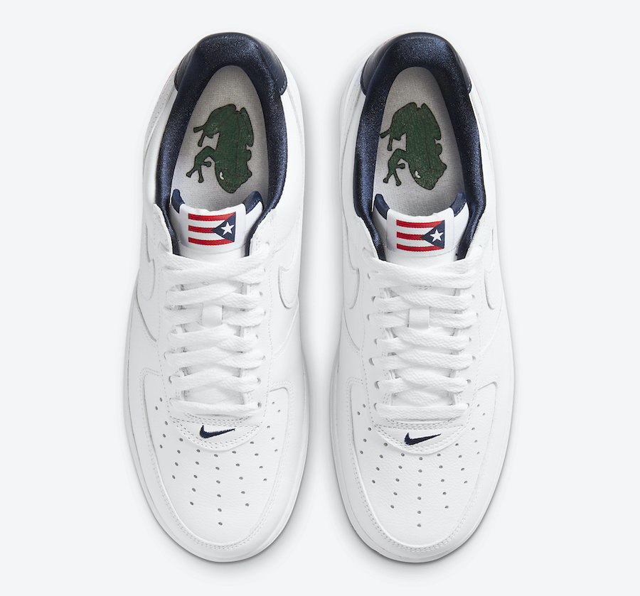 Cette réédition est fidèle en tous points au modèle original. La Nike Air Force 1 revêt une robe principalement blanche contrastée par une semelle extérieure bleue marine et une doublure de même couleur. Une touche de rouge s’affiche pour le branding au talon. Le design s’accompagne de détails intimement liés à l’île qui est un territoire américain. Le drapeau de Porto Rico, directement dérivé de celui du pays de l’Oncle Sam, est apposé au talon et sur la languette. L’image d’une grenouille Coqui, une espèce endémique de cet état insulaire, est dévoilée sur les semelles de propreté. La construction est à base de cuir comme sur le modèle sorti à l’époque.