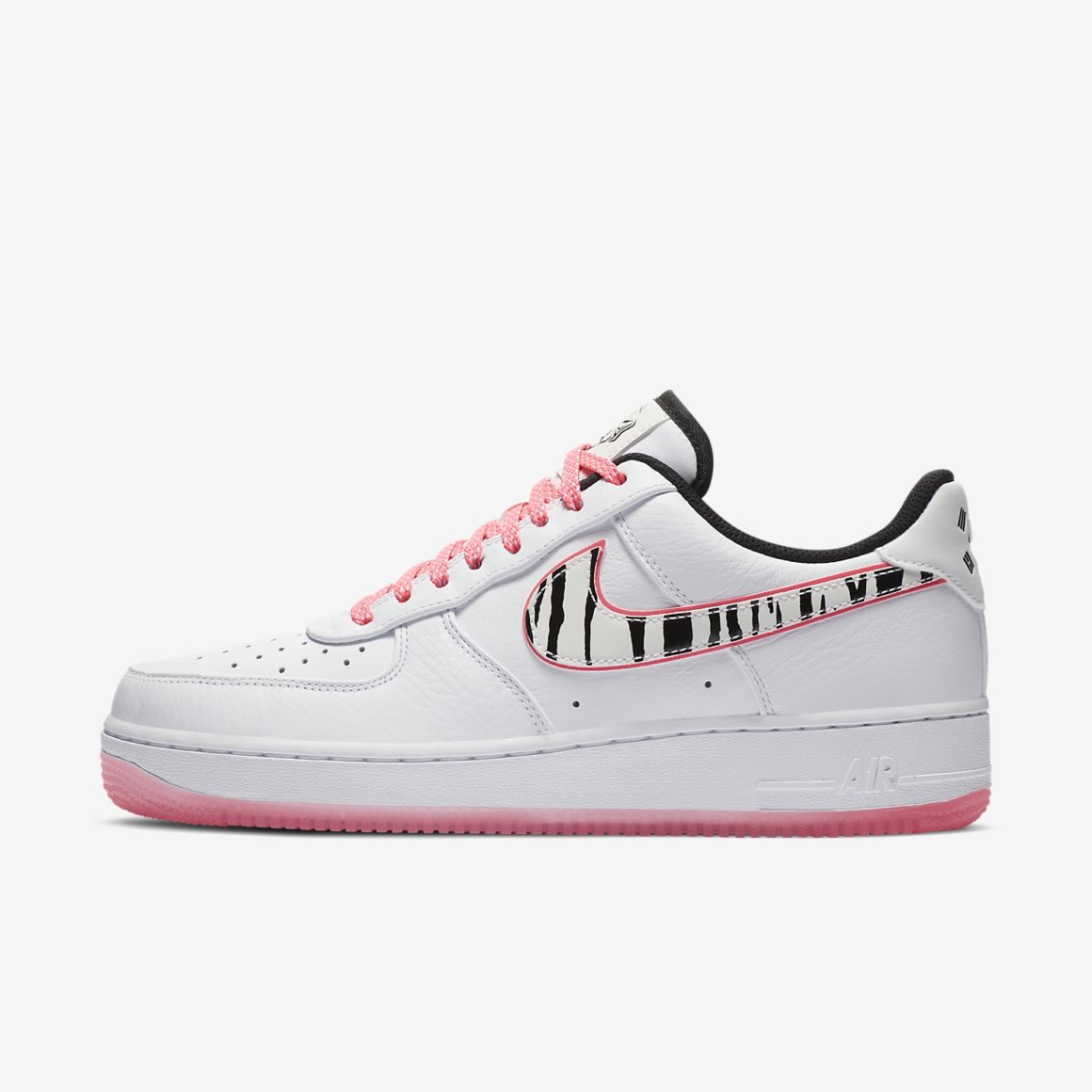 La Nike Air Force 1 est dévoilée dans une robe principalement blanche contrastée par l’ajout de touches de couleur sur les contours du logo latéral, la semelle extérieure, les semelles intérieures ainsi que le jeu de lacets. Ces teintes bleues et roses sont disposées de façon mismatched selon qu’il s’agisse du pied droit ou gauche, une pratique récurrente en ce moment sur les modèles Nike. Le motif « Tiger Camo » sur le Swoosh et les semelles de confort s’inspire des tenues de pré-match qui seront portées par les joueurs. Il a d’ailleurs été dupliqué sur les deux autres paires du pack. Le drapeau sud-coréen est également disposé sur les talons, un détail déjà présent sur l’Air Jordan 3 South Korea. Le tigre d’Asie (le surnom du pays) s’affiche sur la languette. Côté construction, la paire est entièrement construite en cuir. Une semelle semi-translucide complète le design.
