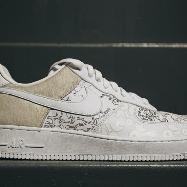 À la manière d’une adidas Top Ten Hi commercialisée en 2014 reprenant un design similaire, cette nouvelle Air Force 1 arbore sur sa partie latérale un imprimé squelette de couleur grise. Il fait bien entendu directement référence à l’un des symboles de cette fête d’origine américaine qui est célébrée dans le monde entier. Ce rendu spécifique propose une vision façon « rayon X » du pied de celui qui porte la silhouette de Bruce Kilgore. Ce procédé est également rappelé à l’intérieur sur la semelle de confort. Ce choix rappelle d’ailleurs la semelle extérieure de la Clot x Air Max 1 qui arborait un imprimé dans le même esprit. Pour mettre en lumière ce traitement spécifique, cette nouvelle Air Force 1 est entièrement blanche et reprend les codes de la Uptown, la paire classique par excellence de ce modèle sorti en 1982. Afin d’apporter un léger contraste, l’outsole est translucide et offre un aspect blanc cassé. Pour rappeler le thème, les designers ont réinventé le logo Nike appliqué sur la languette avec une police d’écriture inspirée des os d’un squelette.