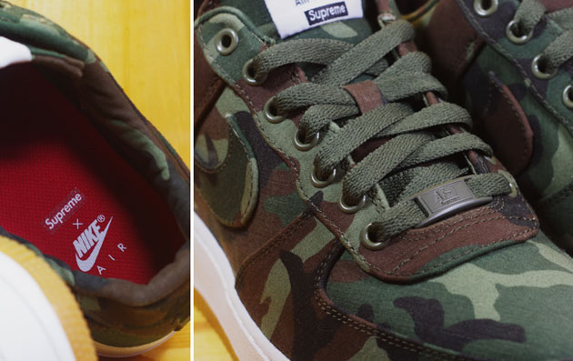 Nous savons déjà depuis quelques semaines que la prochaine collab’ réunissant Nike et Supreme devrait être une série de Nike Air Force 1. Les paires seraient assez simples avec l’utilisation d’une toile cordura et une semelle white/gum. Nous avons aujourd’hui un aperçu du modèle le plus intéressant de la série, la Nike Air Force 1 Supreme camouflage. Vous pourrez la découvrir plus en détails dans la suite mais les couleurs sont à nuancer car le vert semble bien différent selon les images.