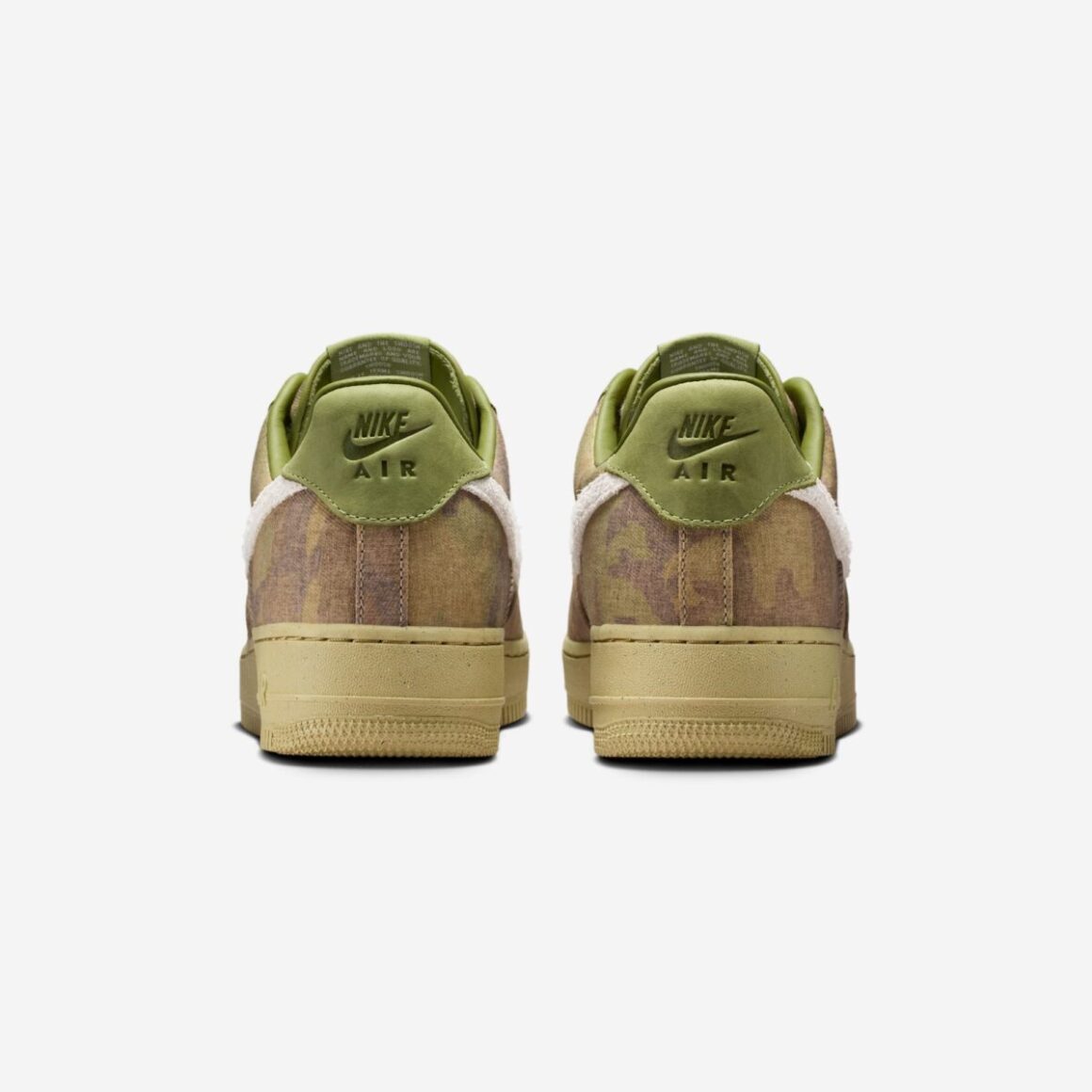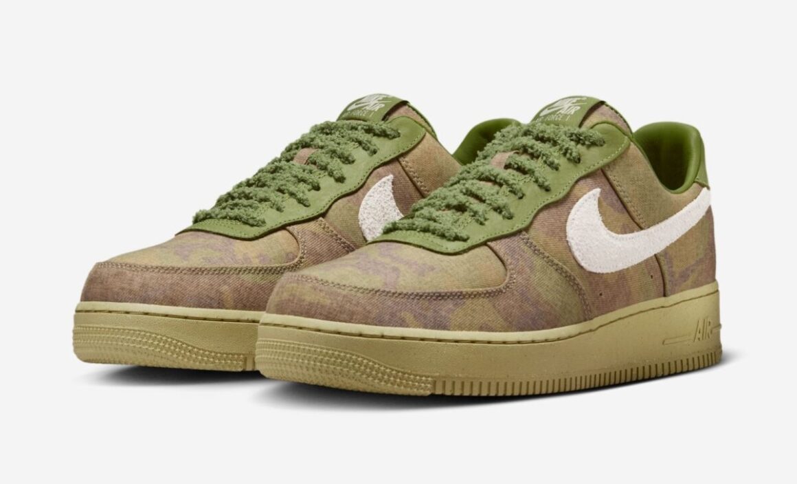 L’élément central du design de cette Nike Air Force 1 Wheatgrass Camo QS réside dans sa base en toile camouflage Wheatgrass, dont les motifs mêlent nuances de vert, de beige et de brun dans une composition inspirée des palettes naturelles. Ce choix visuel évoque autant les surplus militaires vintage que les codes streetwear du début des années 2000, tout en conservant une élégance contemporaine. Contrairement aux imprimés camo très contrastés, cette version privilégie une exécution plus douce et nuancée, donnant à la sneaker une présence visuelle équilibrée et sophistiquée. Pour structurer cette base graphique en canvas, Nike ajoute plusieurs superpositions soigneusement sélectionnées. Le Swoosh apparaît en cuir suédé clair, apportant un contraste subtil sans dominer le motif principal. Les lacets sont verts, épais et pelucheux, rappelant la mousse des arbres. Ils s’accordent en ton aux passages de lacets, au sockliner, ainsi qu’au heeltab, gaufré d’un logo Nike Air. La paire repose sur une semelle intermédiaire beige sable, ajoutant de la cohérence au thème choisi pour cette déclinaison.
