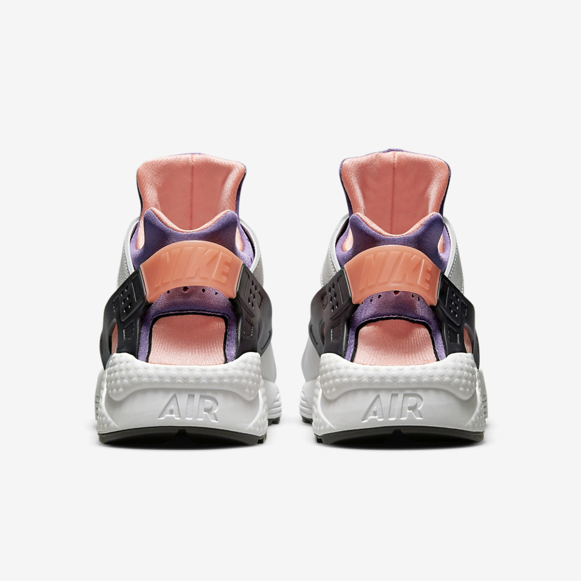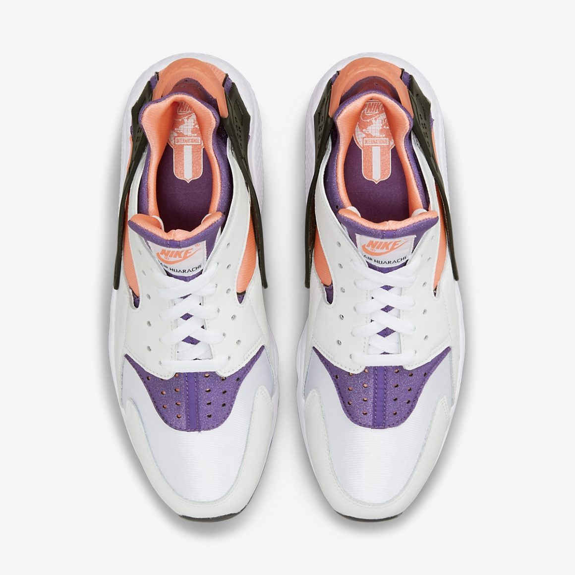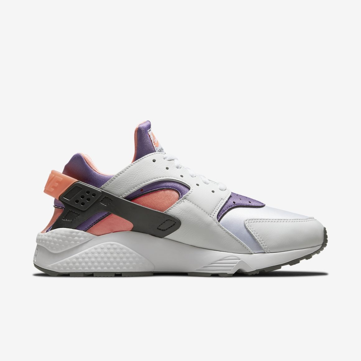 L’exosquelette de la Nike Air Huarache Bright Mango est construit en cuir blanc, habillant le bout avant de la paire et les passages de lacets. La toebox en Néoprène blanc contraste avec le reste du chausson qui alterne entre violet et rose orangé. La partie arrière est construite en TPU noir, tandis que la lanière arrière est rose orangé et arbore l’inscription Nike. La semelle immaculée porte un gaufrage Air à l’arrière et repose sur une semelle extérieure noire. À l’instar des modèles de 1991, cette déclinaison porte à la languette une étiquette cousue blanche avec le nom du modèle.