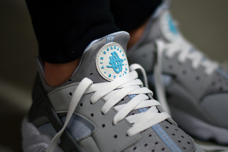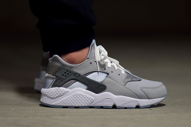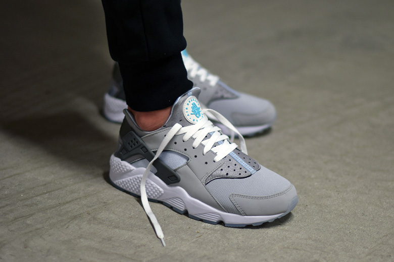 Trois types de matériaux sont présents sur la paire : mesh, nubuck et bien sur le néoprène du chausson Huarache. Plusieurs teintes de gris ont été appliquées mais on reste dans des nuances claires. Les touches de bleu clair sont présentes sur les logos et le chausson. La semelle extérieure en bleu transparent fait un petit rappel.
