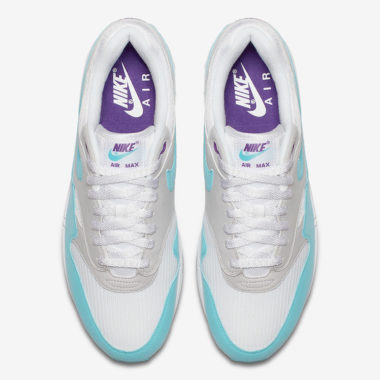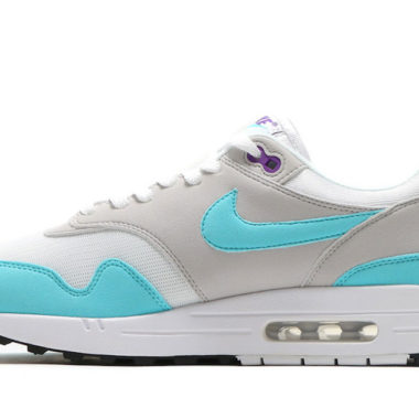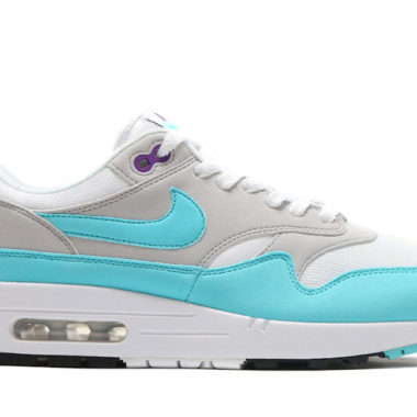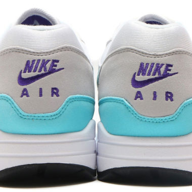 La silhouette classique est de retour dans un combo aqua/violet. Le bleu turquoise réalisé en suede habille le mudguard ainsi que les deux Swoosh, celui sur le côté et celui que l’on retrouve sur la languette. Quelques touches de violet viennent sublimer la paire, sur les œillets des lacets et pour l’inscription « Air Max » sur la languette et au talon. Elle est également présente sur la semelle intérieure. Un gris très clair, en cuir suédé également, complète le design avec du blanc pour la semelle et la toebox, toujours réalisée en mesh. De manière globale, la paire est fidèle à la Air Max 1 originale en terme de matériaux et de look. Seul le coloris vient perturber ce classicisme, mais les plus passionnés auront surement reconnu un modèle féminin OG sorti à la fin des années 80, début des années 90.