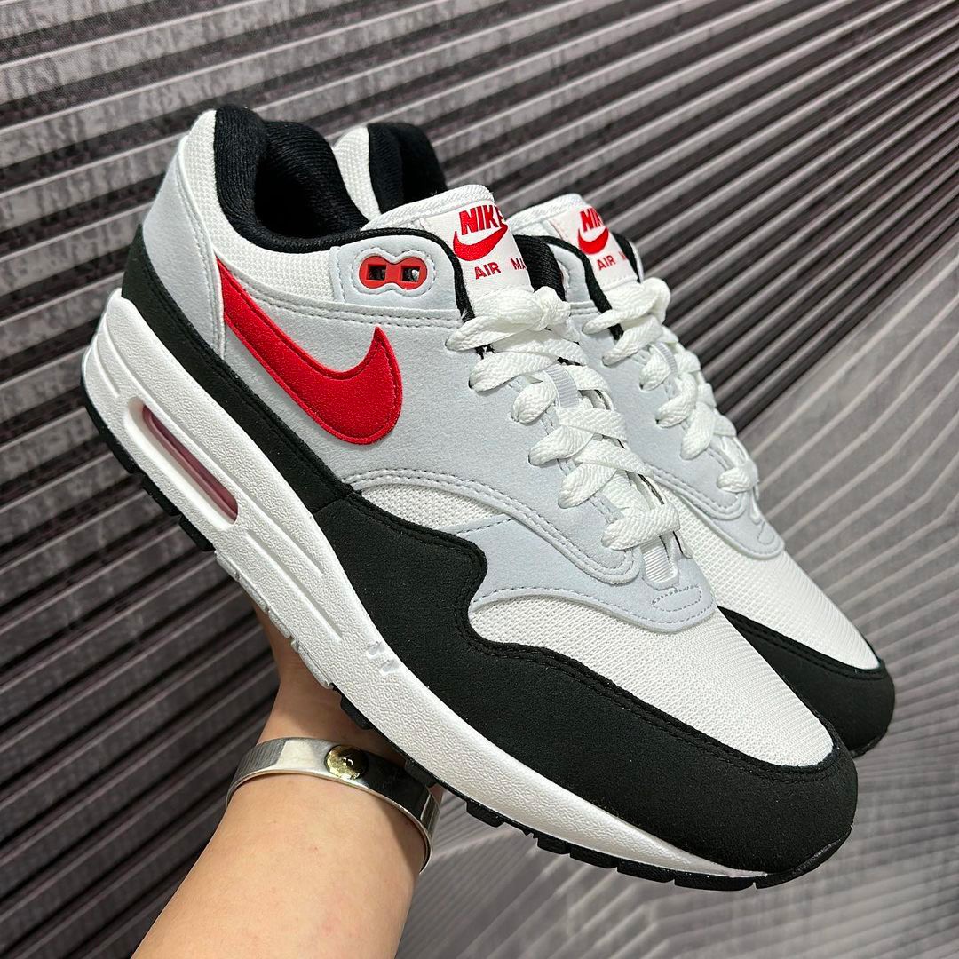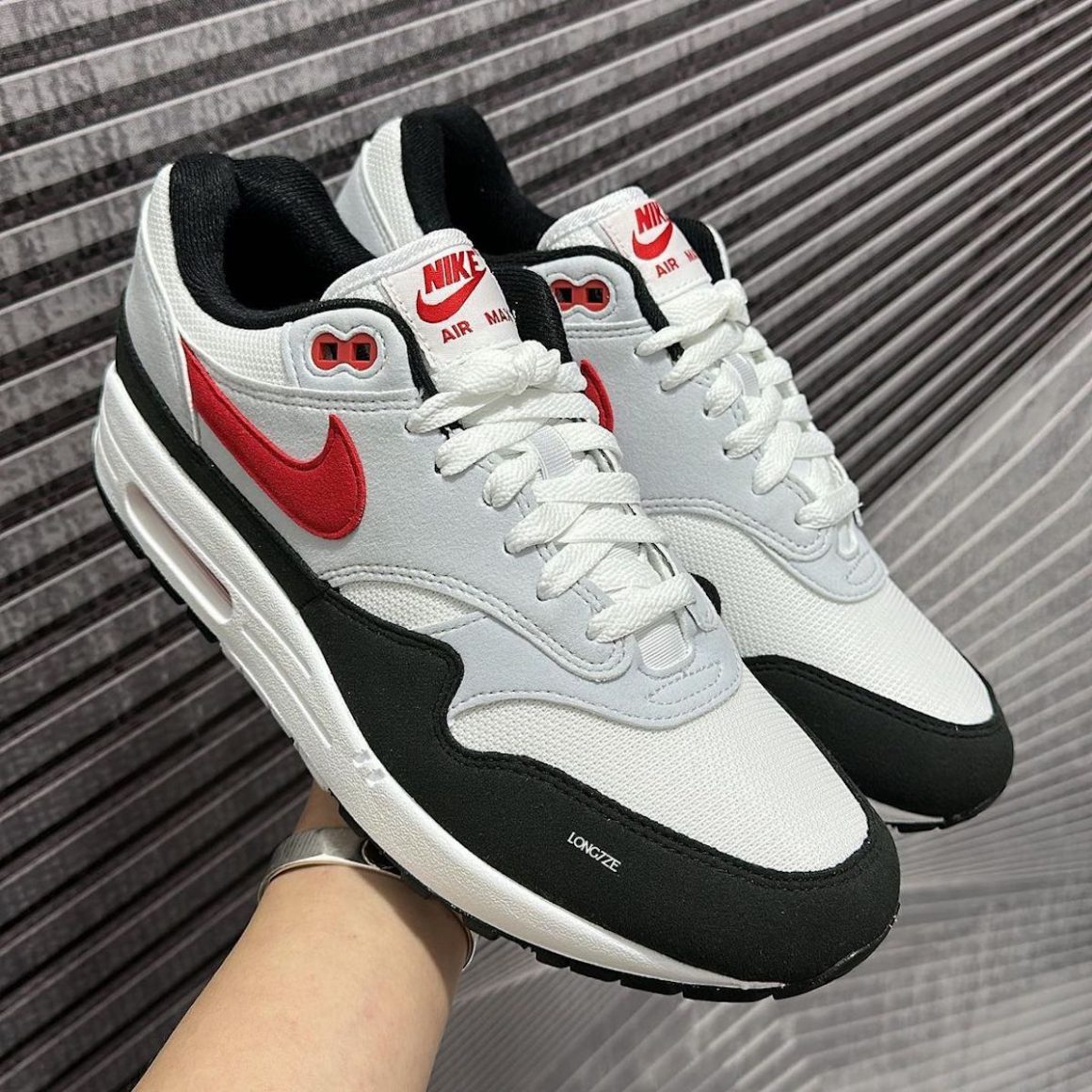 La Nike Air Max 1 Chili 2023 reprend la silhouette running de 1987. Sa base en mesh immaculé est visible sur la toebox, le col de cheville et la languette. Celle-ci est surmontée d’une étiquette au logo Nike Air rouge. Les panneaux latéraux s’habillent de cuir suédé platine, légèrement plus clair que sur l’itération originale. Le garde-boue de la paire est construit en suède noir, et contraste avec le rouge des Swoosh latéraux. Ce rouge se retrouve également sur les œillets supérieurs, ainsi que sur l’unité d’Air visible. Elle est encapsulée dans une semelle intermédiaire immaculée. Celle-ci repose sur une semelle extérieure blanche, aux extrémités noires.