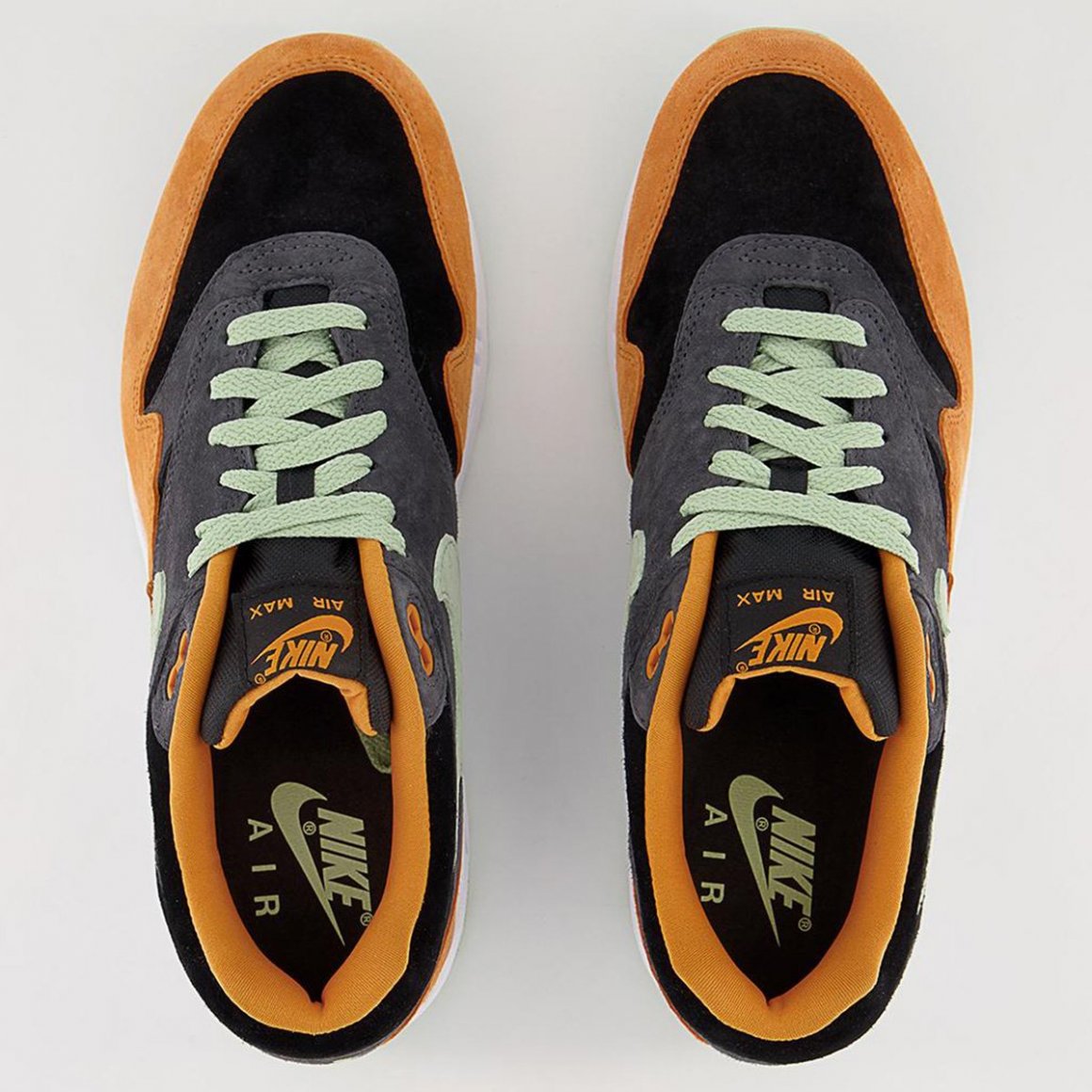 La Nike Air Max 1 Duck Anthracite habille la silhouette de la sneaker des couleurs de la version Ceramic de la Dunk Ugly Duckling. La base en cuir suédé noir pare la toebox et le col de cheville. Les panneaux latéraux anthracite sont sublimés par un Swoosh vert amande, qui s’accorde aux lacets. Pour relever ce design exclusif sur la Air Max 1, le garde-boue s’habille de cuir suédé orange, assorti aux oeillets supérieurs et au sockliner. La languette reprend la combinaison anthracite orange avec son étiquette Nike Air au sommet. Le heeltab est brodé d’une silhouette de canard vert amande, comme pour signer l’appartenance de la paire au pack Air Max 1 Duck. La paire repose sur une semelle intermédiaire immaculée, laissant visible une unité d’air vert amande, qui rappelle la semelle extérieure légèrement mouchetée.