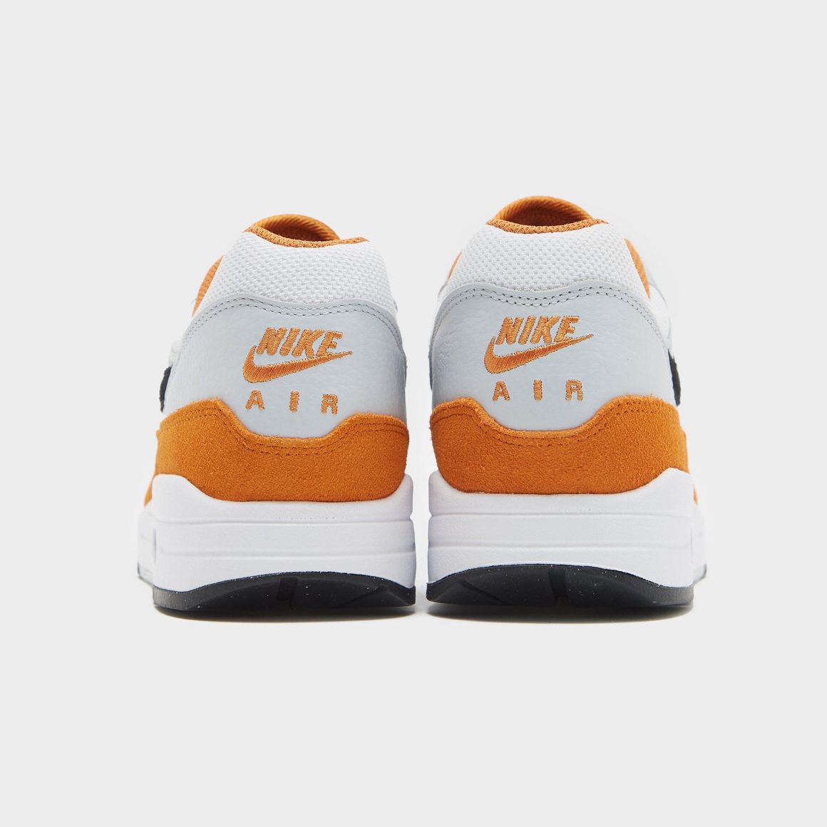 La marque au Swoosh a imaginé un nouveau coloris printanier prévu pour le mois de mai. La future Nike Air Max 1 Monarch possède une tige construite en mesh blanc, visible sur la toebox et le col de cheville. Les panneaux latéraux, la base de la languette, ainsi que le talon se parent de cuir grainé platine. Sur le talon, il est brodé d’un logo Nike Air orange, dont on retrouve le coloris sur le garde-boue en cuir suédé. Ce coloris Orange Monarch est d’ailleurs surement un clin d’oeil à une autre paire designée par Tinker Hatfield à cette même époque, la Nike Air Safari. D’autres touches orange habillent le sockliner et le liseré de la languette en mesh blanc. Elle est surmontée d’un logo Nike Air Max noir, assorti aux Swoosh latéraux en cuir suédé et aux œillets supérieurs. La paire repose sur une semelle intermédiaire immaculée, sertie d’une unité d’Air visible. Une semelle extérieure aux extrémités noire finalise cette nouvelle déclinaison du classique de Nike.