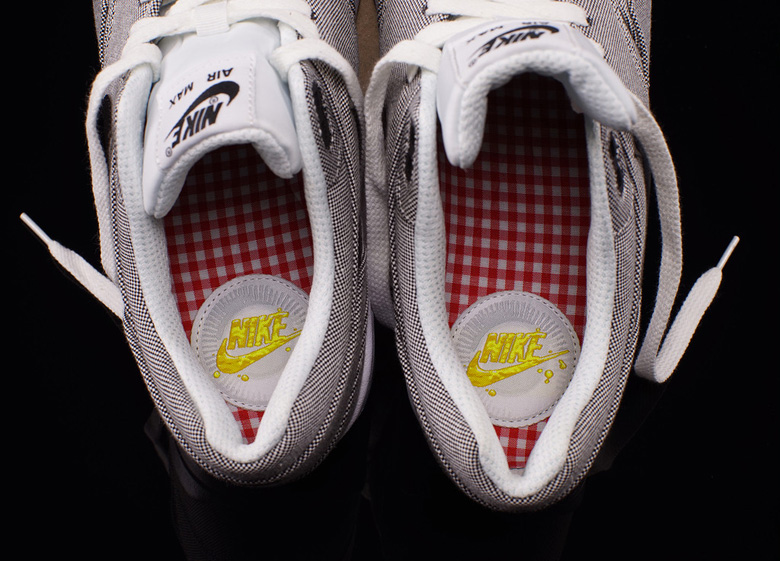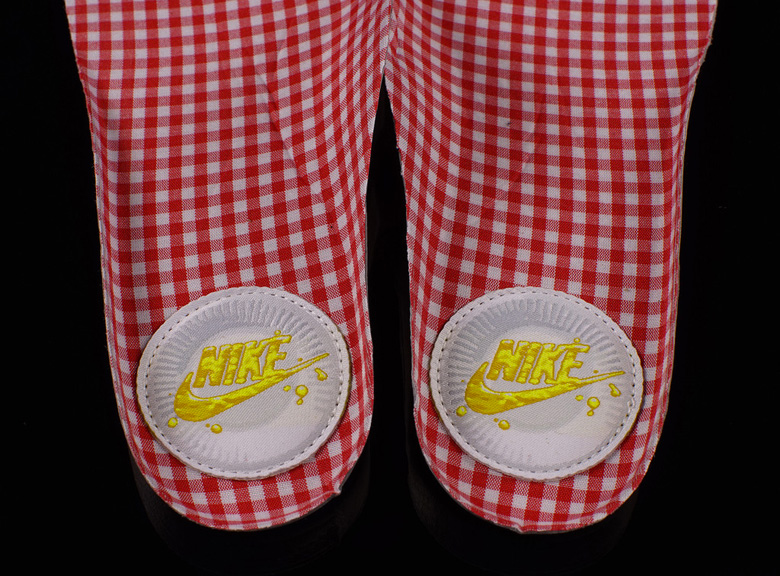 À y regarder de plus près on se rend compte que la semelle intérieure dispose d’un imprimé vichy comme les fameuses nappes utilisées pour des repas en plein-air. Le logo Nike se retrouve également sur cette partie de la sneaker sur un patch brodé qui représente une assiette en carton.
