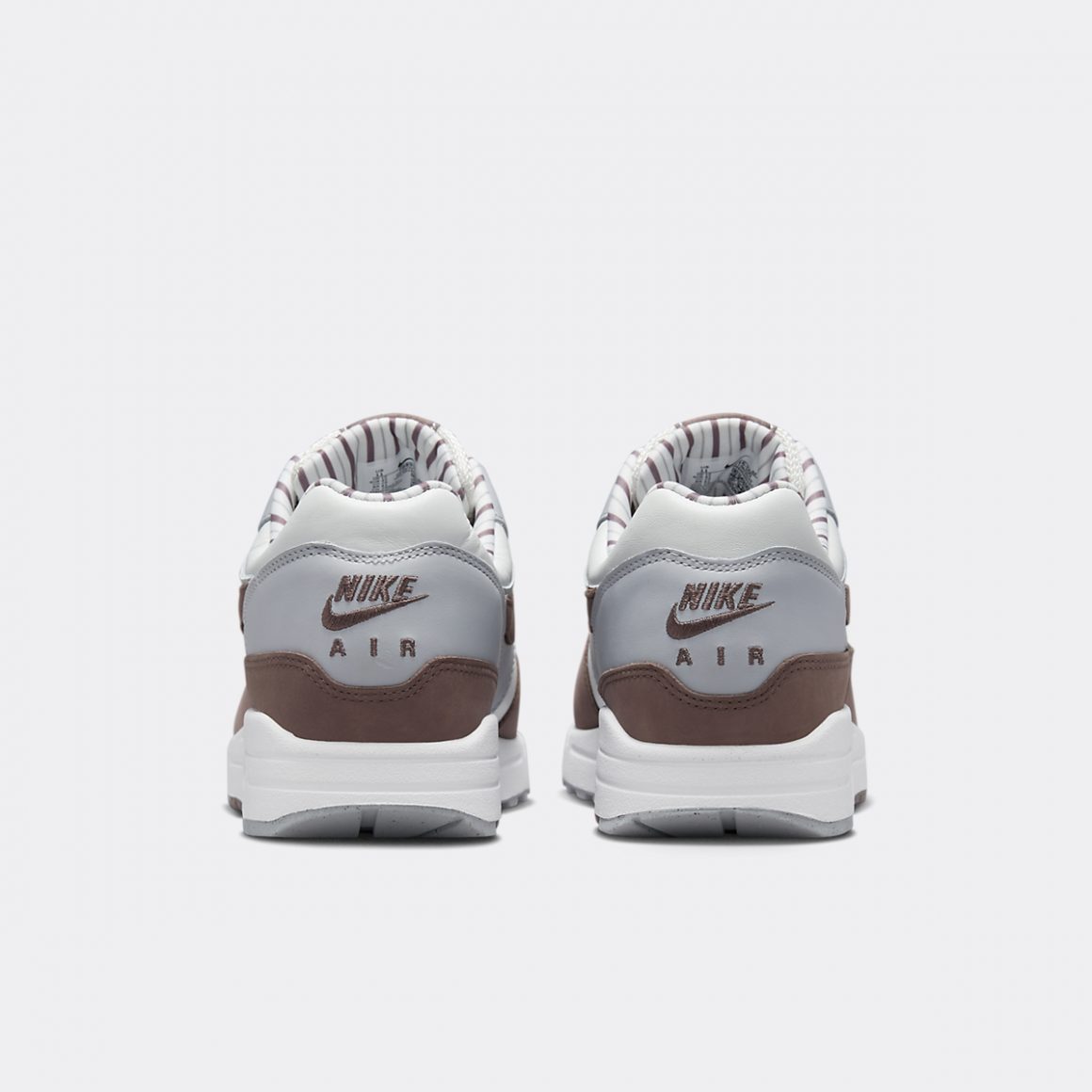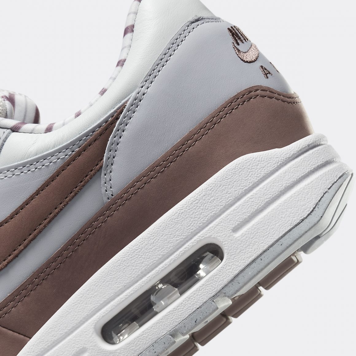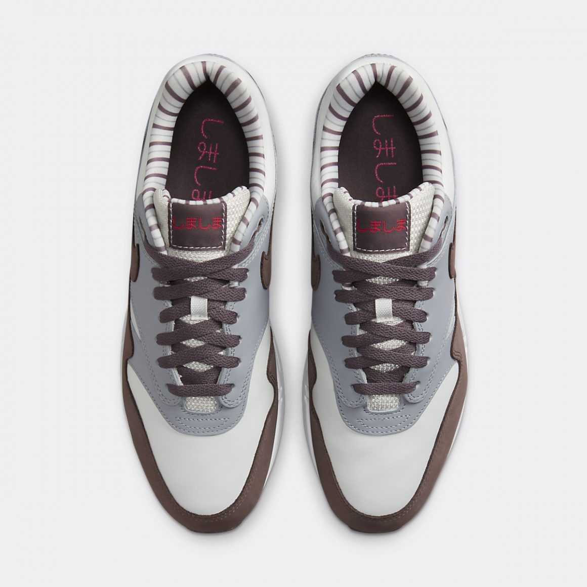Pour cette édition 2023, la Nike Air Max 1 Shima Shima se pare d’une construction chromatique inédite. La base est construite en cuir lisse blanc, visible sur la toebox et le col de cheville. Le sockliner blanc est traversé de rayures verticales tantôt marron, tantôt grises. Ce gris habille également le cuir lisse des panneaux latéraux et du talon. Ce dernier est brodé d’un logo Nike Air marron, assorti au cuir suédé du Swoosh latéral. Le garde-boue de la paire est en cuir suédé marron et se marie aux lacets et à l’étiquette de la languette. On y retrouve les kanji Shima Shima en rouge, repris également sur les semelles intérieures. La paire repose sur une semelle intermédiaire immaculée et une semelle extérieure alternant entre gris et marron.