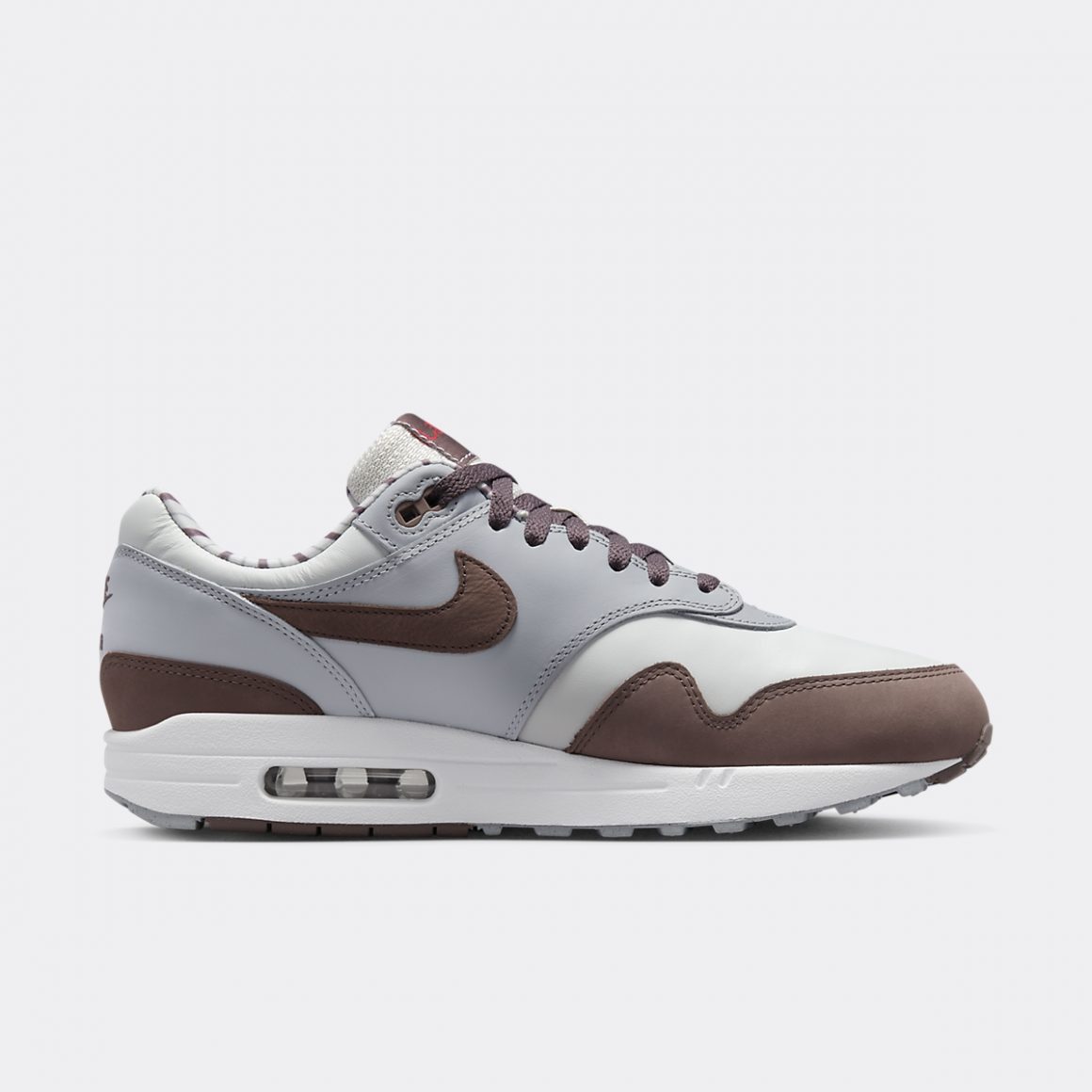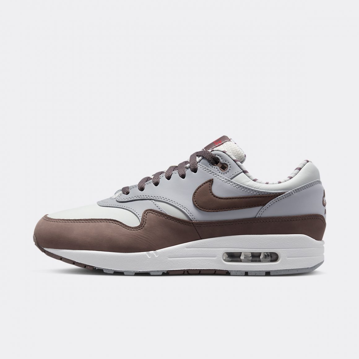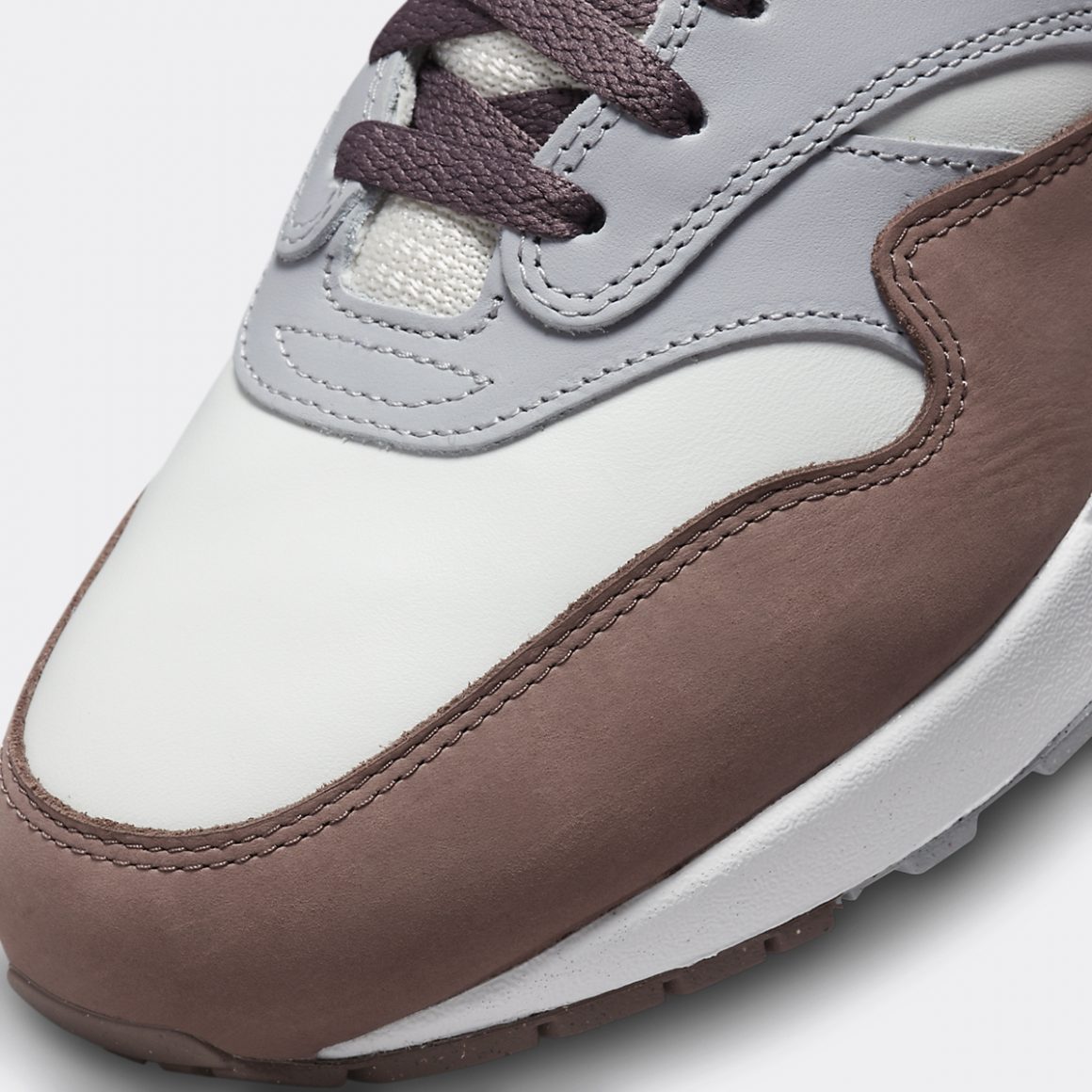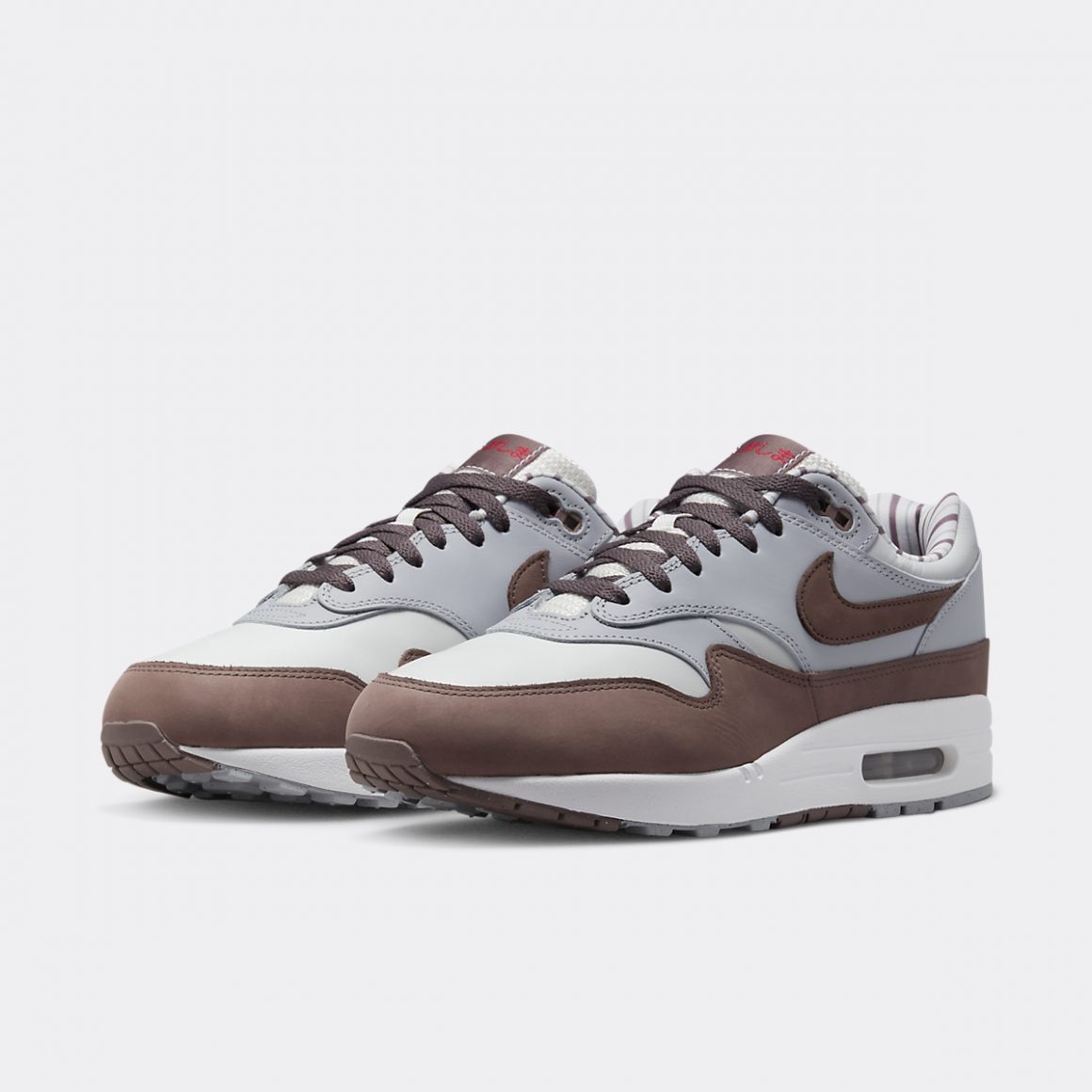 Pour cette édition 2023, la Nike Air Max 1 Shima Shima se pare d’une construction chromatique inédite. La base est construite en cuir lisse blanc, visible sur la toebox et le col de cheville. Le sockliner blanc est traversé de rayures verticales tantôt marron, tantôt grises. Ce gris habille également le cuir lisse des panneaux latéraux et du talon. Ce dernier est brodé d’un logo Nike Air marron, assorti au cuir suédé du Swoosh latéral. Le garde-boue de la paire est en cuir suédé marron et se marie aux lacets et à l’étiquette de la languette. On y retrouve les kanji Shima Shima en rouge, repris également sur les semelles intérieures. La paire repose sur une semelle intermédiaire immaculée et une semelle extérieure alternant entre gris et marron.