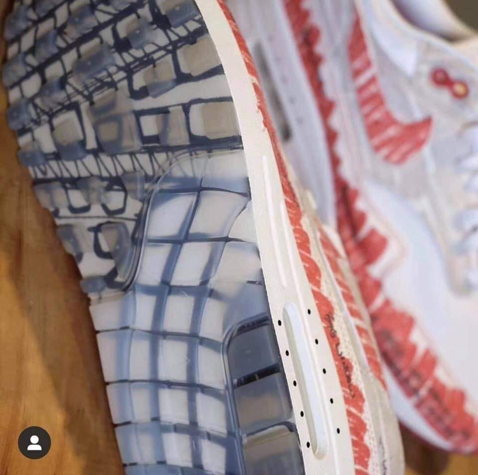 Cette Nike Air Max 1 « Sketch » propose un design très particulier. En effet, de nombreux détails faisant référence aux dessins de son créateur Tinker Hatfield figurent sur l’ensemble de la paire. Afin de coller au mieux à son histoire, elle est proposée dans son coloris OG White/Red. À la manière d’un croquis, le mudguard ainsi que le Swoosh sont coloriés en rouge. Cette coloration approximative, qui laisse apparaître du blanc, offre un look unique à cette version. On retrouve le classique mesh blanc sur la toe-box ainsi que sur le collier. Les parties en suede sont grises, tout comme pour la version OG. Un patch présentant un logo Nike dessiné figure sur les languettes.