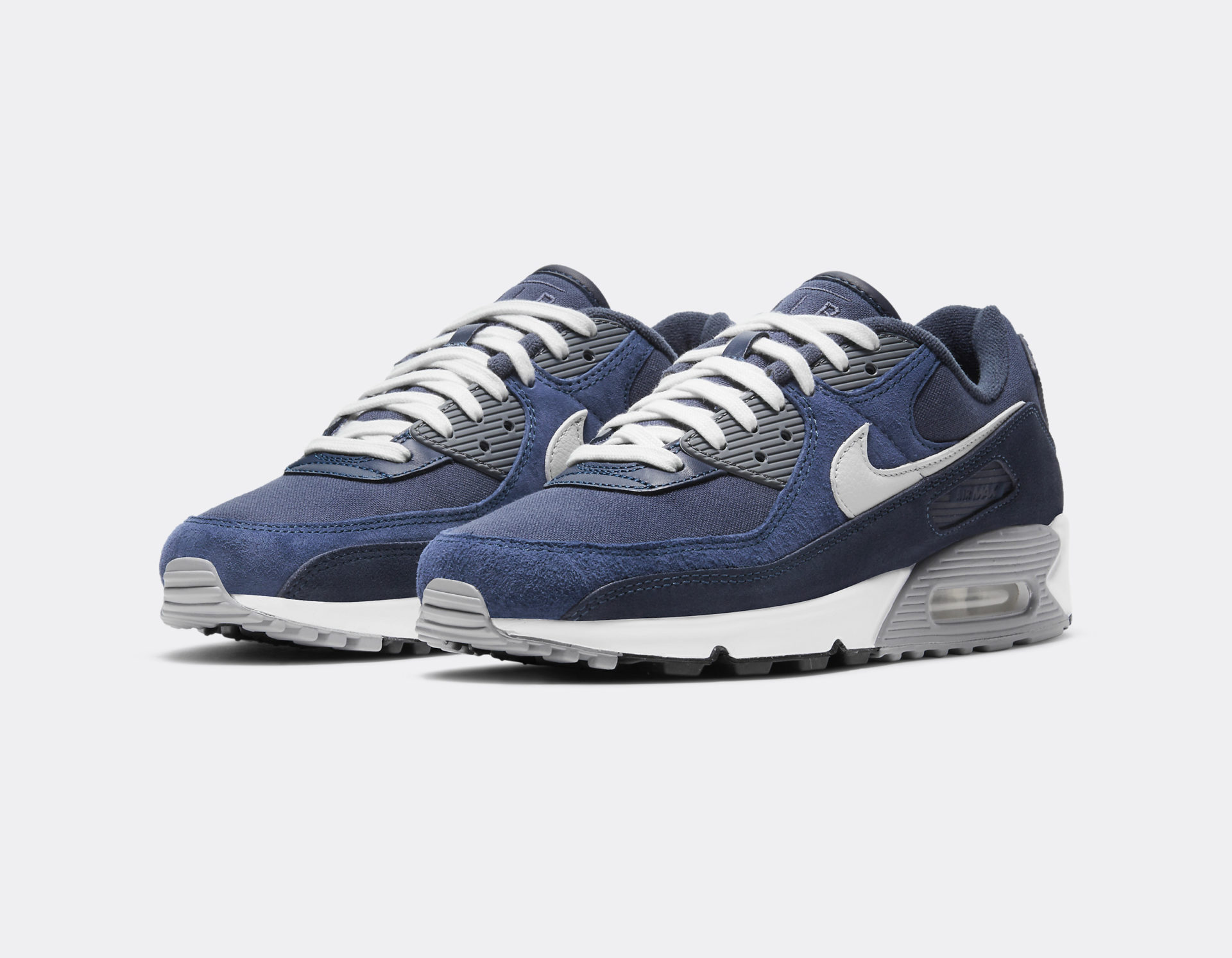 Le premier coloris, baptisé Light Smoke Grey, est un camaïeu de gris sur différentes matières. Les panneaux latéraux et les gardes-boues se parent de cuir suédé en deux teintes de gris, claire pour les premiers et anthracite pour les seconds. Entre les deux, un Swoosh en cuir blanc rappelle la semelle. La base des passages de lacets en cuir gris joint la toebox et la languette, en canvas gris clair. Cette dernière est cousue d’une inscription Air Max inédite et son sommet est liseré de cuir anthracite. Le heeltab en canvas est orné du classique empiècement au talon de la Air Max 90 avec un logo Nike Air blanc.