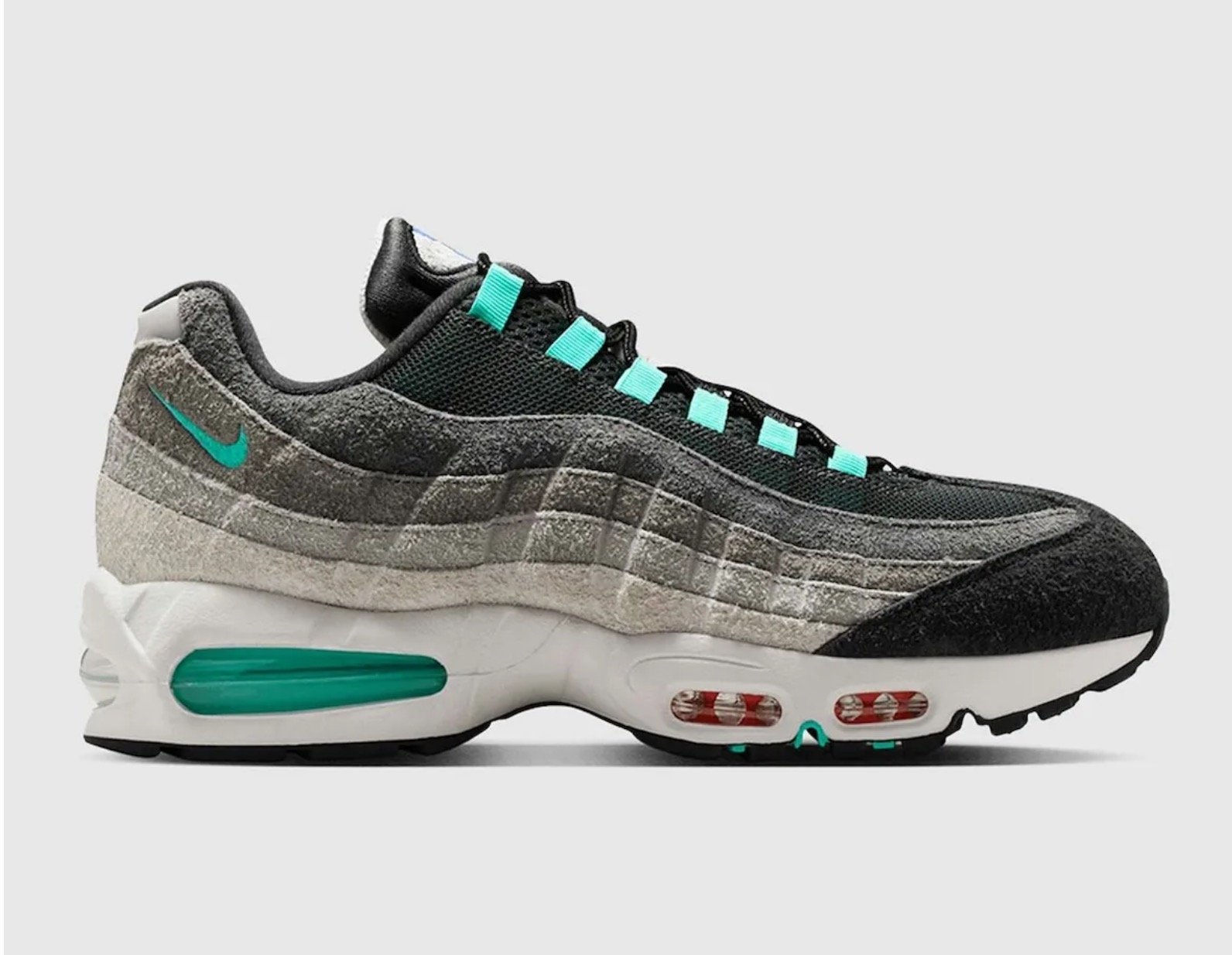 Visuellement, la Nike Air Max 95 Big Bubble Greedy 2026 reprend presque à l’identique le look de la version originale, avec des panneaux gris en dégradé, des touches de jaune Volt, de rouge, de bleu et d’orange réparties sur les œillets et les logos. Les deux chaussures ne sont pas identiques, ce qui renforce l’effet patchwork. Les mini Swoosh, les lacets, les passants et même les unités Air affichent des couleurs différentes selon le côté. La semelle intermédiaire blanche contraste avec les éléments colorés et permet de garder une base cohérente malgré la variété de teintes. La semelle extérieure noire vient compléter l’ensemble et renforce l’aspect rétro de la paire. L’ensemble donne une sneaker très chargée visuellement, mais parfaitement cohérente avec l’esprit du coloris Greedy, qui a toujours été pensé comme une célébration de l’histoire de la Air Max 95 plutôt qu’un simple coloris classique.