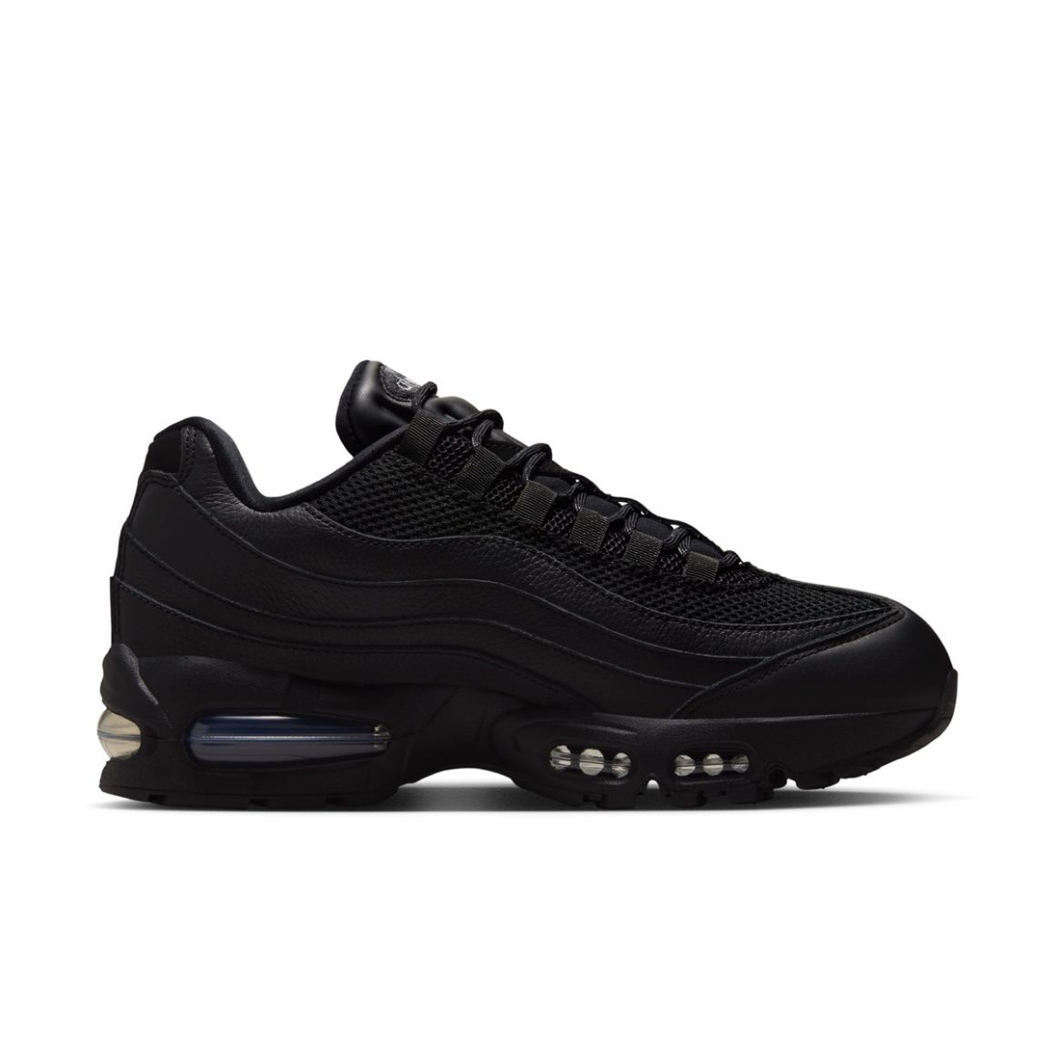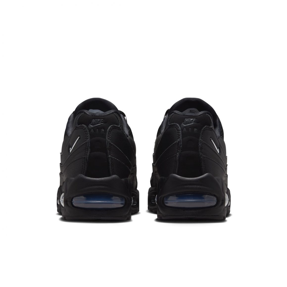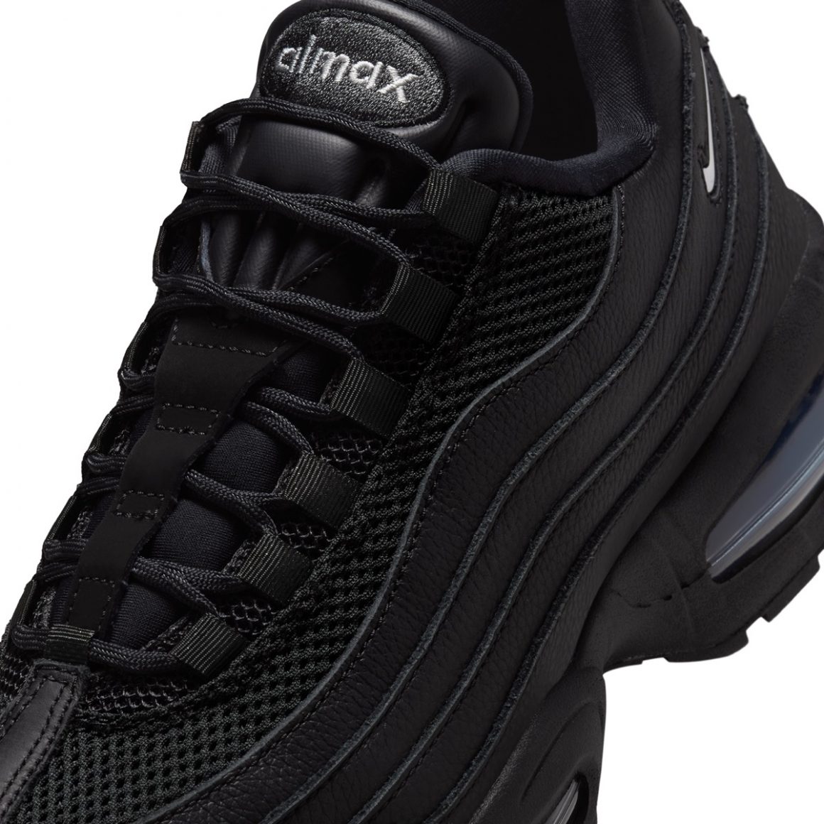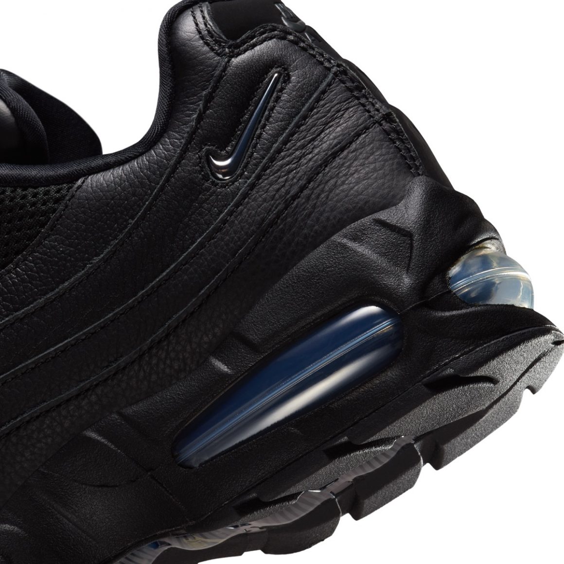 Cette Nike Air Max 95 Big Bubble “Triple Black” joue la carte du monochrome absolu. La tige conserve la construction en strates qui a fait la légende de la Air Max 95, mais chacune de ces couches se décline en noir dans un cuir épais. Le tout est surmonté par du mesh respirant noir. Ce choix visuel met en avant la profondeur des textures et la géométrie organique du modèle, créant un effet sculptural particulièrement marquant. Les lacets, les œillets et même le logo sur la languette adoptent la même teinte sombre, contribuant à cette impression de silhouette furtive. Pour contraster avec cette construction monochrome, l’inscription Air Max se pare de gris platine, tandis que le mini Jewel Swoosh sur le quart arrière affiche un effet translucide. La paire repose sur une semelle intermédiaire noire, sertie d’unités d’Air visible aux allures bleutées.