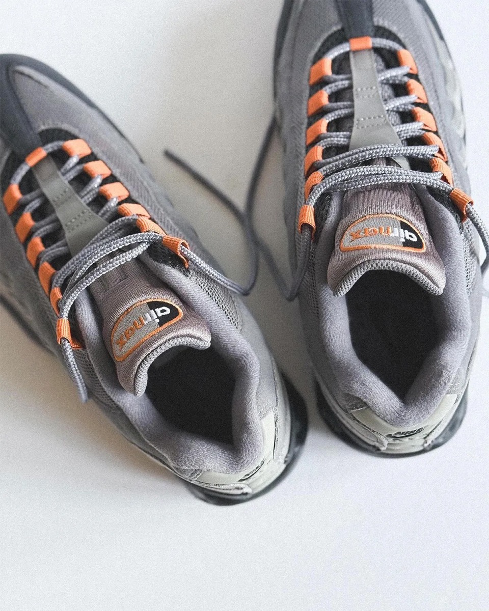 La Nike Air Max 95 Hot Curry conserve tous les codes visuels qui ont façonné l’histoire du modèle : empiècements superposés sur la tige évoquant les couches du corps humain, la bulle d’Air visible qui traverse la semelle intermédiaire, et une palette contrastée devenue iconique. Dans cette version, la teinte dominante est le gris, dans un dégradé rappelant les versions originales Neon ou Solar Red. Cette construction en camaïeu de gris est relevée par des touches orange, donnant son surnom à cette itération. Ces touches orange habillent les œillets des passages de lacets, ainsi que le cartouche du logo Air Max 95 au sommet de la languette. Le mini Swoosh latéral s’habille également d’orange, liseré de noir. La paire repose sur une semelle intermédiaire anthracite, traversée d’unités Air orange.