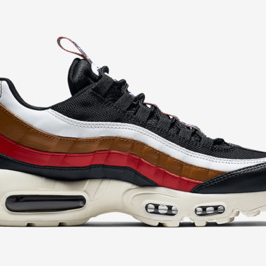 Les équipes Nike ont choisi d’utiliser essentiellement du cuir pour la conception de cette Air Max 95. Côté coloris, un astucieux mariage de blanc, de marron et de rouge a été imaginé pour habiller cette paire. On retrouve ces couleurs sur le côté, sur les bandes indissociables de ce modèle. Le résultat est judicieux car elles s’associent parfaitement à la « pull tab » sur laquelle on distingue également la lettre « N » déclinée sur l’ensemble de sa surface. À cela s’ajoute un bleu marine à la teinte particulièrement foncée, construit en mesh. Il épouse les contours dédiés à l’emplacement des lacets. La semelle est, elle, proposée en blanc cassé, ce qui contraste assurément avec les bulles d’air noires.