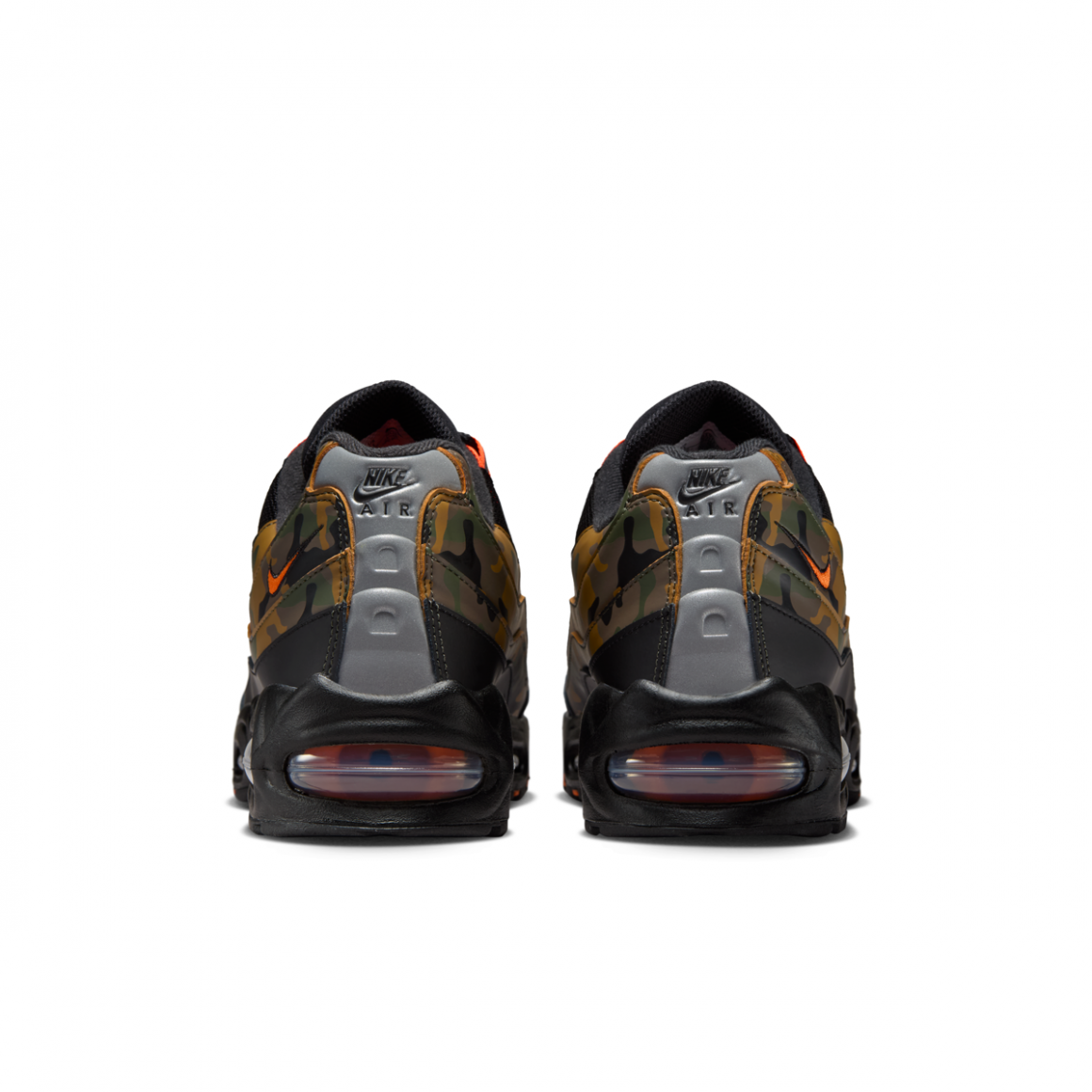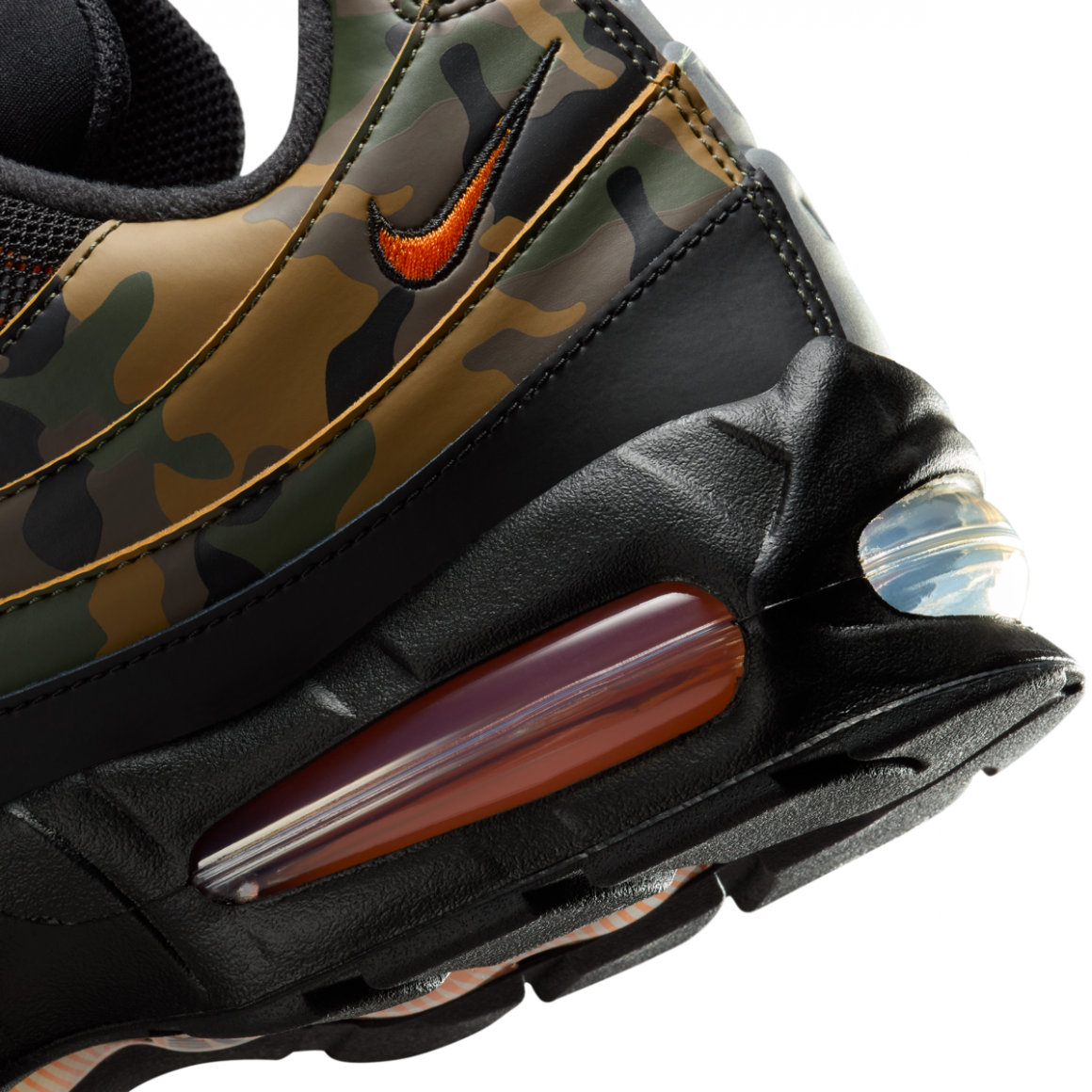 La Nike Air Max 95 QS Camo Black Safety Orange joue la carte de la puissance et du contraste. Ici, le camouflage adopte une palette plus traditionnelle, dominée par le kaki et le vert. Ce fond sert d’écrin à des accents orange éclatants, présents sur les œillets et le mini-Swoosh latéral. Ce contraste immédiat donne à la paire une énergie explosive, évoquant l’équipement militaire haute-visibilité et les codes de la sécurité. La construction reprend le même principe de couches superposées, mais l’ensemble se veut plus discret, presque furtif, à l’exception des touches orange qui attirent instantanément l’œil. La semelle intermédiaire noire vient renforcer cette impression de puissance, tandis que les bulles d’air teintées d’orange rappellent la cohérence de l’ensemble. Cette version, plus agressive que la Court Purple, s’adresse à ceux qui cherchent une Air Max 95 avec une identité forte et assumée.