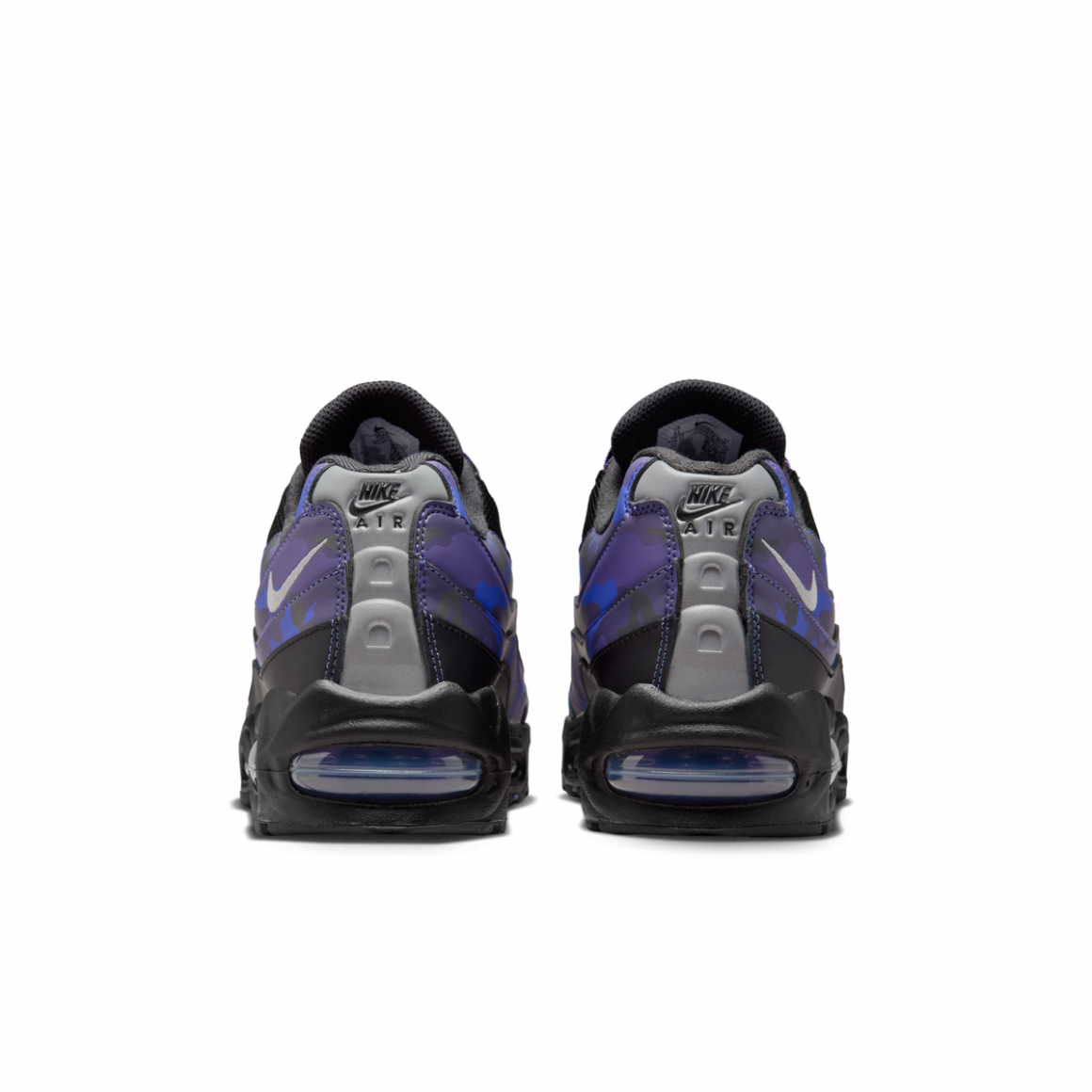 La Nike Air Max 95 QS Camo Court Purple se distingue par une approche audacieuse du camouflage. Sur une base de violet profond, le motif Camo se déploie en dégradés subtils de pourpre, de bleu et de noir, créant un rendu à la fois militaire et sophistiqué. Le choix de cette teinte, rarement associée au camouflage, apporte une dimension presque luxueuse à la paire. La tige conserve la construction caractéristique de la Air Max 95, avec ses strates horizontales évoquant les muscles et la peau. Le mesh noir respirant domine la partie supérieure, tandis que les superpositions en cuir camouflé viennent rythmer la silhouette. Les lacets ronds noirs s’intègrent parfaitement à l’ensemble, tandis que des accents en matière réfléchissante apportent de la luminosité. Un mini Swoosh platine complète le quart arrière de la sneaker. La semelle intermédiaire noire, dotée des unités Air visibles teintées de violet, complète ce look singulier. Le résultat est une sneaker qui associe l’audace du motif militaire à une palette chromatique inattendue, idéale pour se démarquer sans tomber dans l’excès.