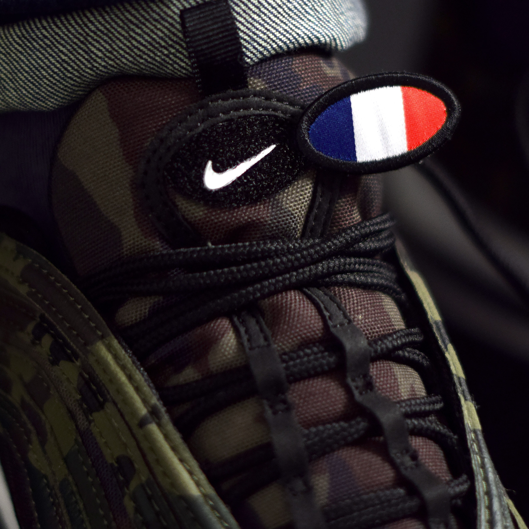 Concernant le modèle lui-même, son empeigne affiche plusieurs types de matières – suédé, cuir et toile – sur lesquels apparait un camouflage dans des tons verts foncés. Les Swoosh sur les cotés sont très discrets, en noir. C’est d’ailleurs la même teinte qui a été choisie pour l’intérieur de la volumineuse bulle d’air. Le reste de la semelle extérieure est blanc avec quelques touches d’orange bien pêchu. On retrouve sur le haut de la languette un patch aux couleurs françaises. Lorsqu’il est retiré, il laisse apparaitre un empiècement velcro affichant un Swoosh blanc qui rappelle parfaitement la semelle des sneakers.