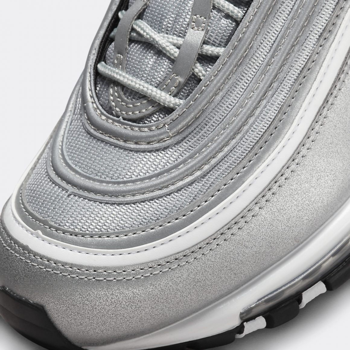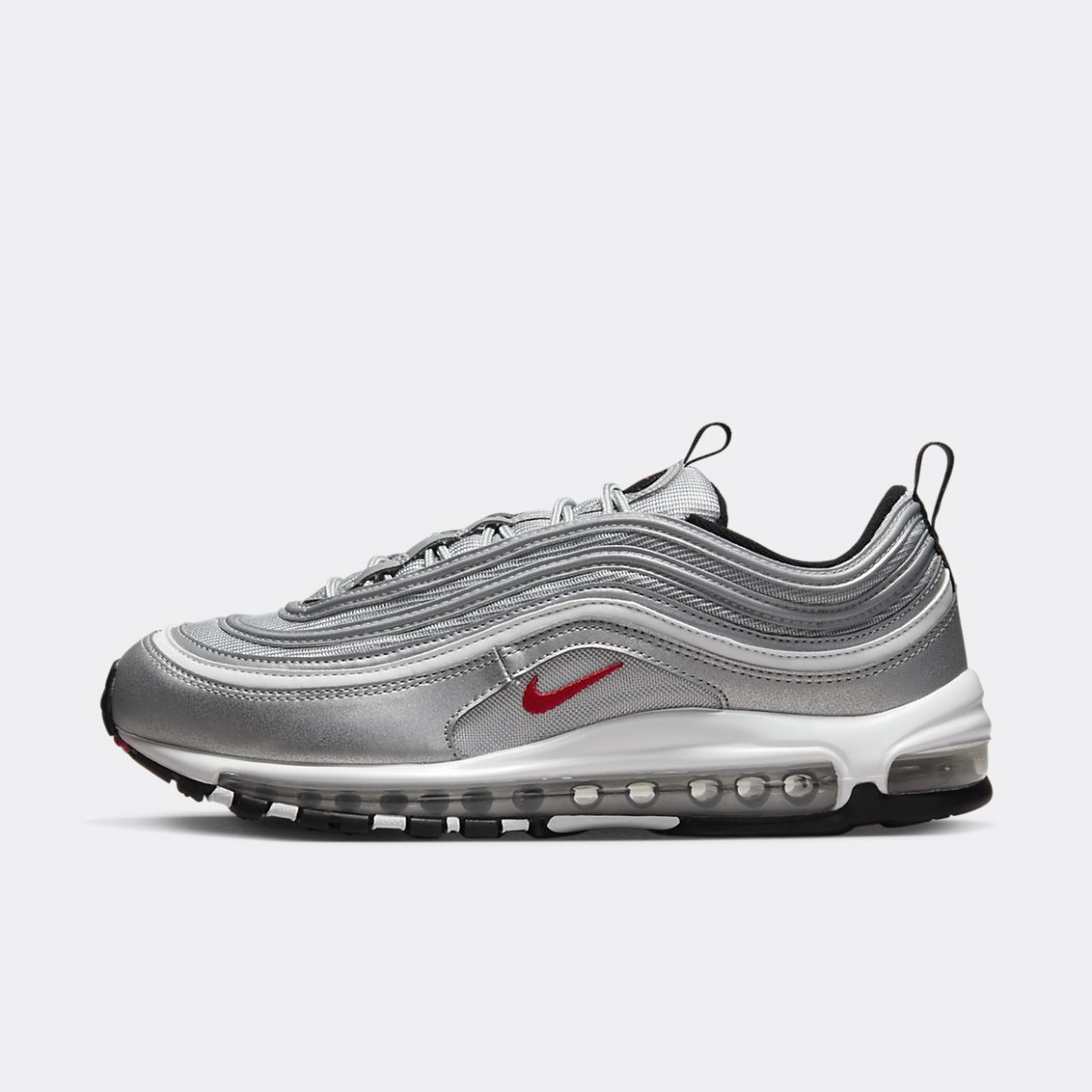 La Nike Air Max 97 OG Metallic Silver Bullet est construite comme une superposition de couches, alternant entre mesh et cuir argent. Des parties réflectives ajoutent au côté futuriste de la paire. Parmi les vagues de la tige, une se distingue du reste en arborant du blanc. La base de cette tige porte un cartouche en mesh balistique, brodé d’un mini Swoosh rouge. Ce rouge se retrouve sur le cartouche noir au sommet de la languette. Cette dernière est surmontée d’une tirette noire, dont on retrouve une autre version au talon. Celle-ci est plus étoffée et porte des liserés rouges, ainsi qu’une inscription Air Max. La paire repose sur une semelle intermédiaire immaculée, traversée par une unité d’air sur toute sa longueur. La semelle extérieure alterne entre noir et blanc, pour terminer sur un liseré rouge sur la partie avant.