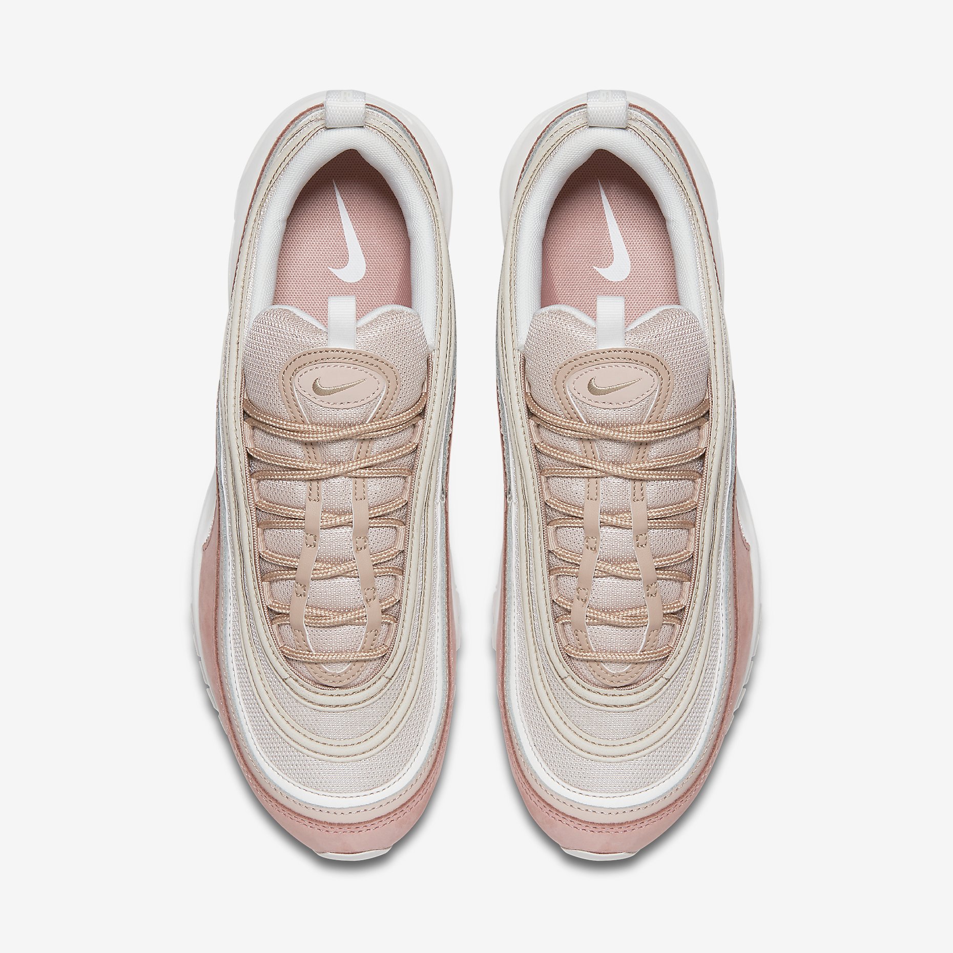 Ces trois Nike Air Max 97 Premium reprennent en effet la même conception. Réalisée à l’aide d’une base en mesh, elle utilise du nubuck pour le reste de l’empeigne. La partie basse arbore ce cuir particulier au rendu de très belle qualité. On retrouve les caractéristiques emblématiques du modèle tel que le mini-Swoosh ou encore les bandes réfléchissantes. La semelle Air Max blanche visible à 360° permet de terminer cette silhouette en lui conférant une forme bien affinée sur l’avant. La première déclinaison combine du gris et du beige jaunâtre (Light Pumice) alors que la seconde se décline dans une teinte gris-bleu (Wolf Grey). La troisième édition est un peu plus girly avec une association de rose clair et de beige (Rush Pink).