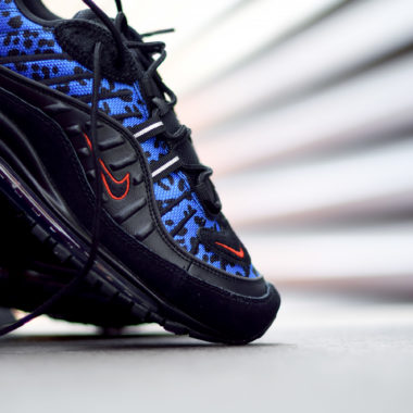 La paire dessinée par Sergio Lozano s’affiche dans une robe principalement noire agrémentée de touches de couleur bleu et rouge. Le print léopard est appliqué sur la partie haute de la chaussure, intégré au design dans un coloris bleu tacheté de noir. L’imprimé se veut plus sobre sur cette version et sa conception en mesh diffère du reste de la paire, en cuir mais aussi en suede pour le mudguard. Autre détail original renvoyant directement au félin africain, la présence d’un pony hair sur les œillets des lacets. Les contours du Swoosh noir sont rouges et ce coloris chatoyant est dupliqué au talon et sur la virgule à l’avant. Le patch de l’intérieur du pied est de même couleur sur ce modèle et est lui aussi doté d’un imprimé, qui est rappelé sur les deux semelles de confort pour un jeu de symétrie intéressant. La semelle et son unité Air Max semi-translucide sont noires pour reprendre la base chromatique de ce modèle. Enfin, des éléments 3M viennent compléter le look et proposent un détail visuel intéressant car uniquement visible dans l’obscurité.