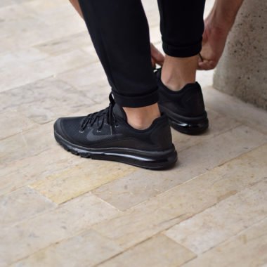 Pour cette édition, la Nike Air Max More est toujours dotée d’une empeigne construite avec un mesh tricoté, proche du tissage Flyknit. Elle est associée à des empiècements thermocollés qui renforcent le bas de la sneaker. On retrouve les logos Nike Air Max et Swoosh à différents endroits sur la paire comme à l’avant du pied, sur le côté ou en haut de la languette. Sa semelle Air Max, visible à 360°, similaire à celle de l’Air Max 2017, vient compléter sa silhouette. Cette déclinaison arbore une teinte monochrome noire qui lui procure un aspect à la fois sobre et discret.