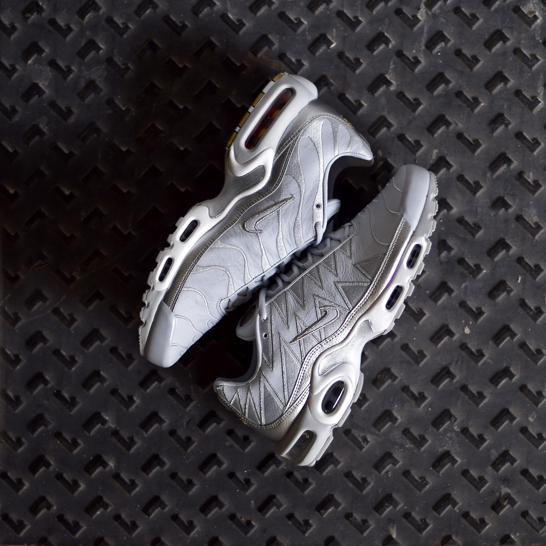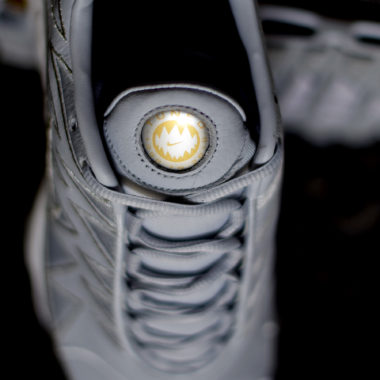 Pour cette édition limitée, la sneaker revêt une empeigne en cuir argent métallisé contrastée par des coutures et des empiècements argentés. On remarque, sur les côtés extérieurs des sneakers, que les traditionnelles vagues ont laissé leur place à des broderies en forme de zig-zag. Ces broderies font directement allusion au surnom donné à l’Air Max Plus, la Requin. On retrouve, de nombreux éléments de branding notamment sur la languette ainsi que sur le talon. Son design est complété par une semelle blanche et argentée comportant des petites touches d’or sur la semelle d’usure ainsi qu’à l’intérieur de l’unité Air Max. La combinaison de matériaux de qualité et la présence de nombreux détails lui confèrent un aspect très qualitatif.