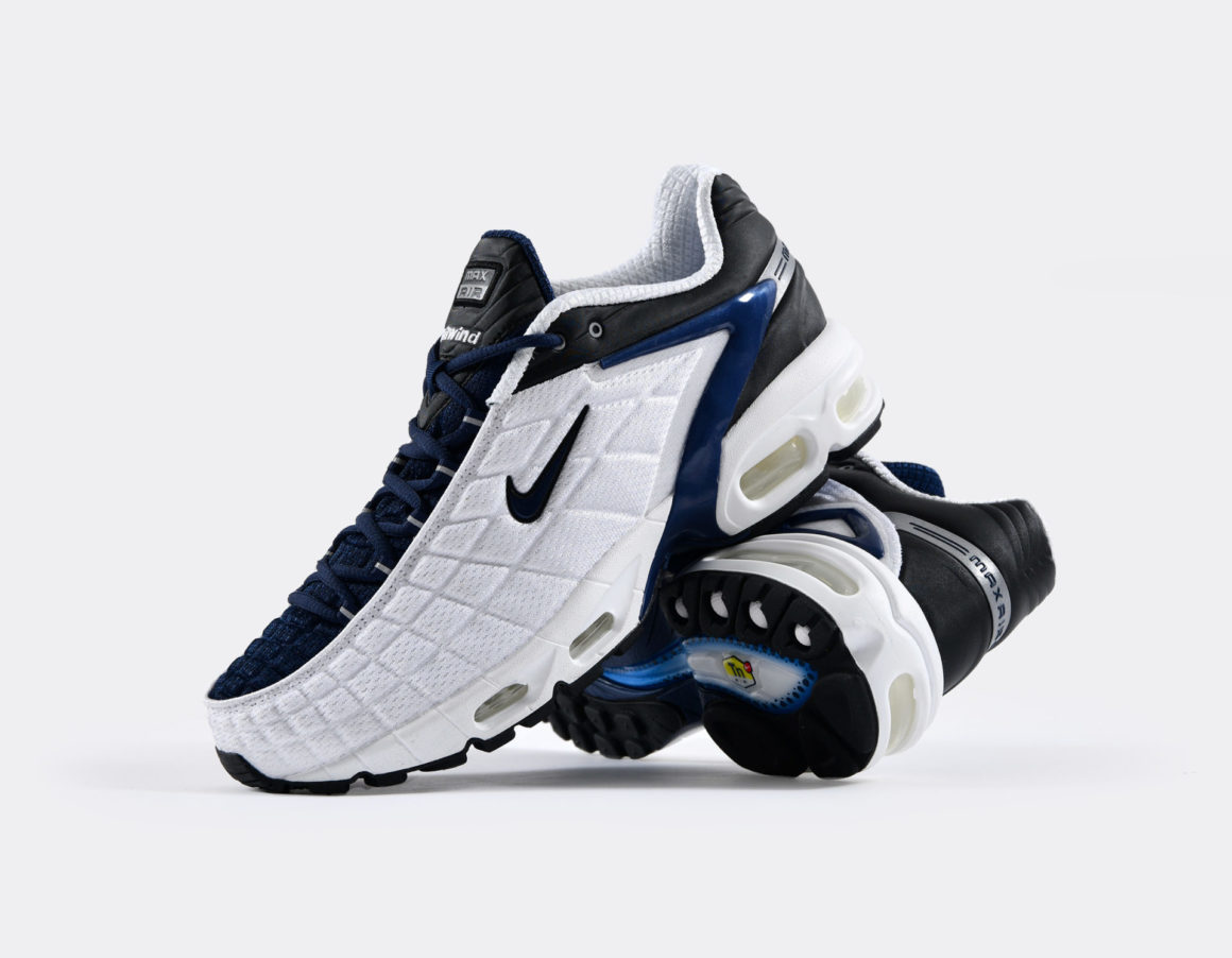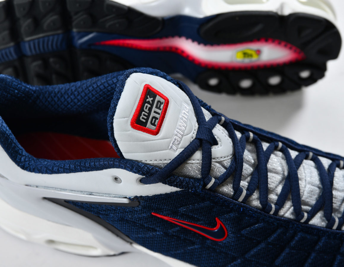 Le second coloris OG qui revient est le coloris USA. Le mesh quadrillé s’habille de marine, qui contraste avec le blanc de la languette et de la toebox. L’arrière est immaculé et la pièce en TPU caractéristique du modèle s’y accorde. L’inscription Air Max de la languette et le mini Swoosh latéral sont toutes deux liserées de rouge, que l’on retrouve sur l’inscription au talon. La semelle intermédiaire blanche repose sur une semelle extérieure noire reprenant le logo Tn de la technologie de Beaverton.