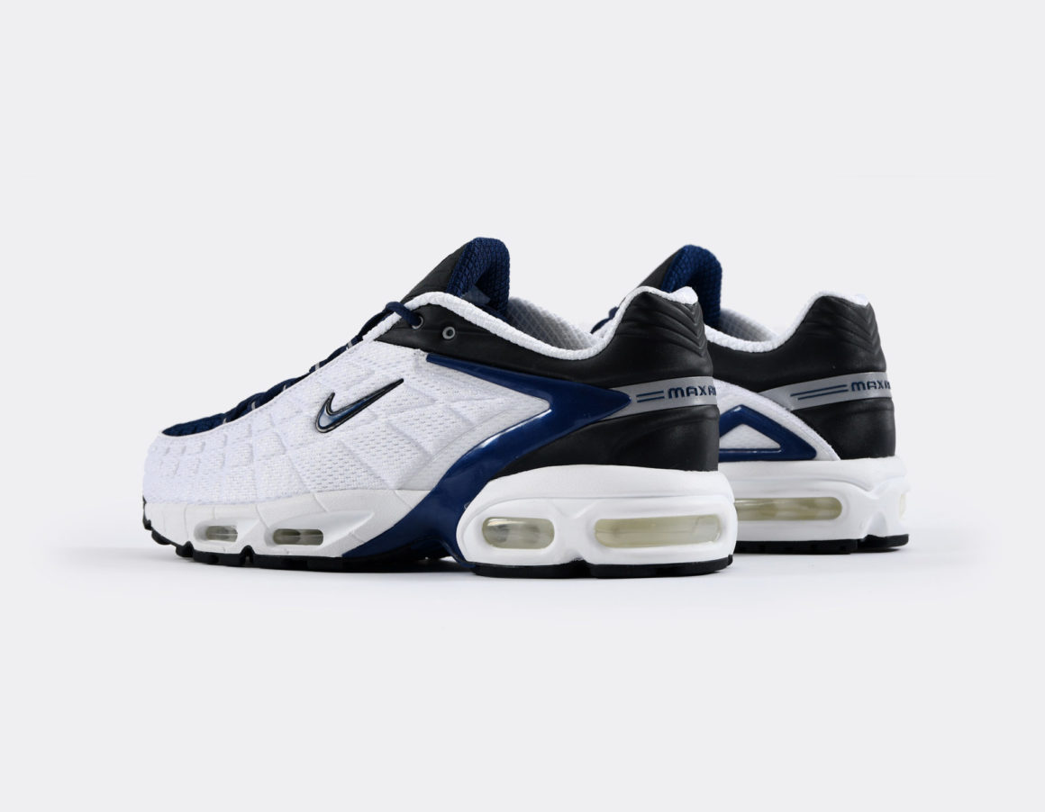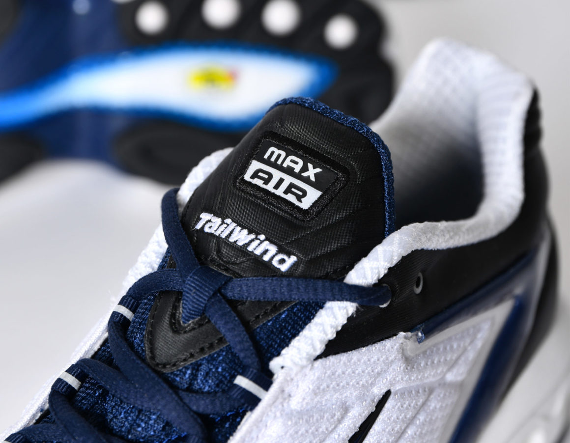 La silhouette running de la Tailwind 5 revient d’abord dans son coloris original White Navy. Son empeigne est construite dans un mesh quadrillé blanc à l’avant. Une pièce en TPU marine sépare l’avant de l’arrière de la paire, ce dernier étant fait de matière synthétique noire. Cette matière et cette couleur se retrouvent sur le haut de languette, qui porte l’inscription Air Max Tailwind. Un mini Swoosh latéral marine s’accorde à la languette et à la toebox en mesh. La semelle intermédiaire blanche possède des unités d’air visibles sur l’ensemble de sa longueur.