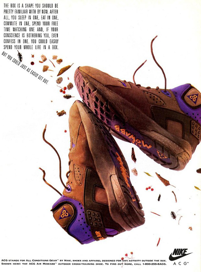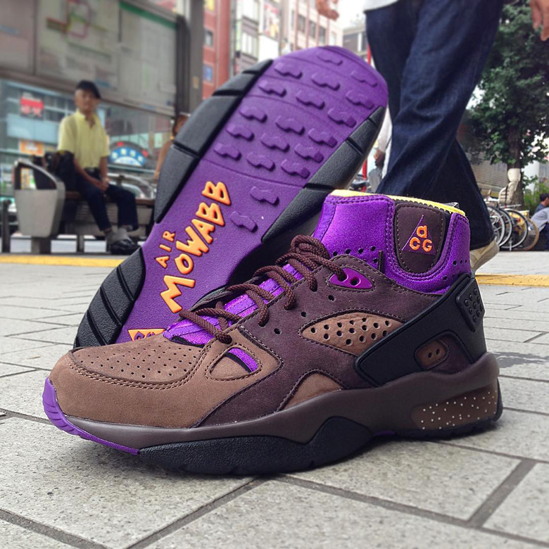 La paire avait été mise en avant à travers une publicité à l’époque. On retrouve ces fameux combos de couleurs de la gamme ACG avec un mélange audacieux de marron avec de l’orange, du violet et du noir. Cette Nike Air Mowabb Trail End Brown est normalement prévue au Japon dans les semaines à venir et un peu plus tard en Europe.