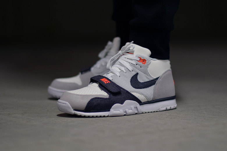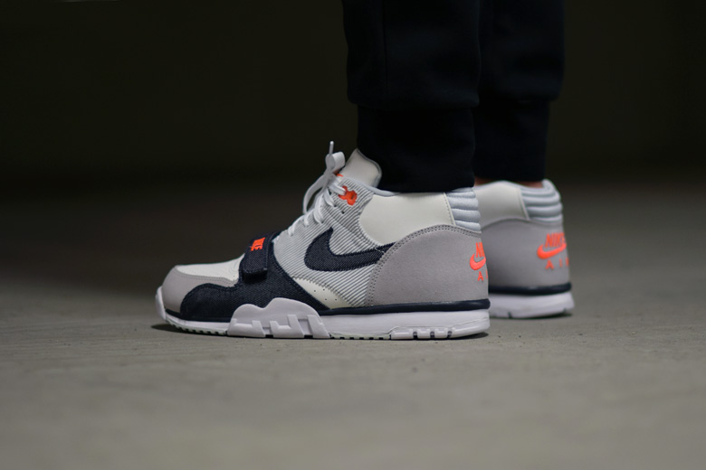 Cette Nike Air Trainer 1 ne fait partie de ce programme mais est au moins tout aussi intéressante. Les amateurs du modèle reconnaitront l’application d’un cuir perforé blanc à l’avant, comme sur le modèle original. En revanche le traditionnel empiècement cousu sur la languette est remplacé par une inscription brodé sur un joli cuir. Deux types de matériaux inédits ont été appliqués sur l’empeigne : de la toile denim (jean) bleu marine et du velours côtelé. Les designers ont eu la bonne idée de rajouter une petite touche de couleurs avec cet orange (Dark Orange chez Nike).