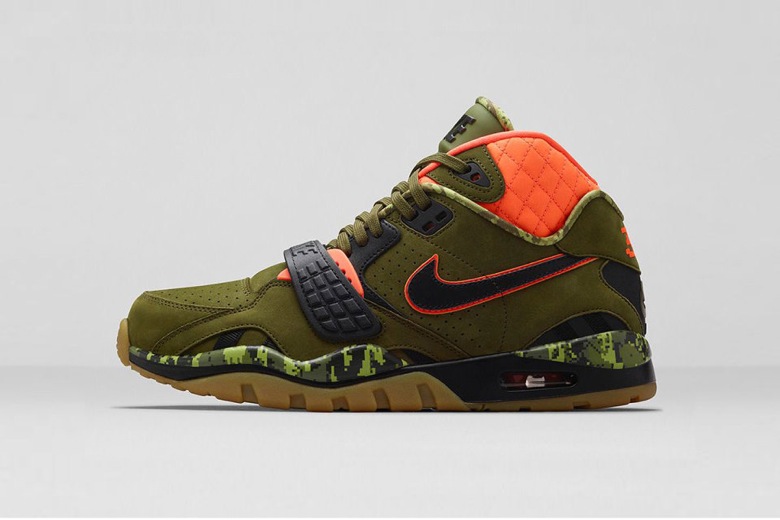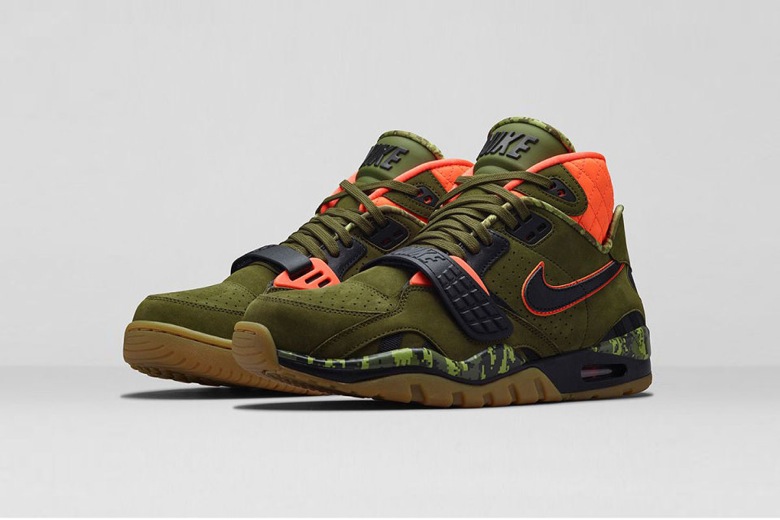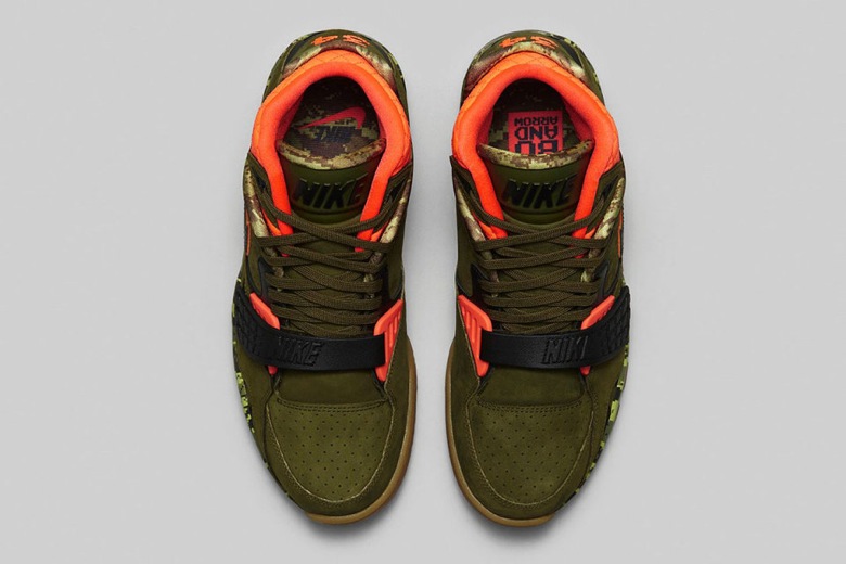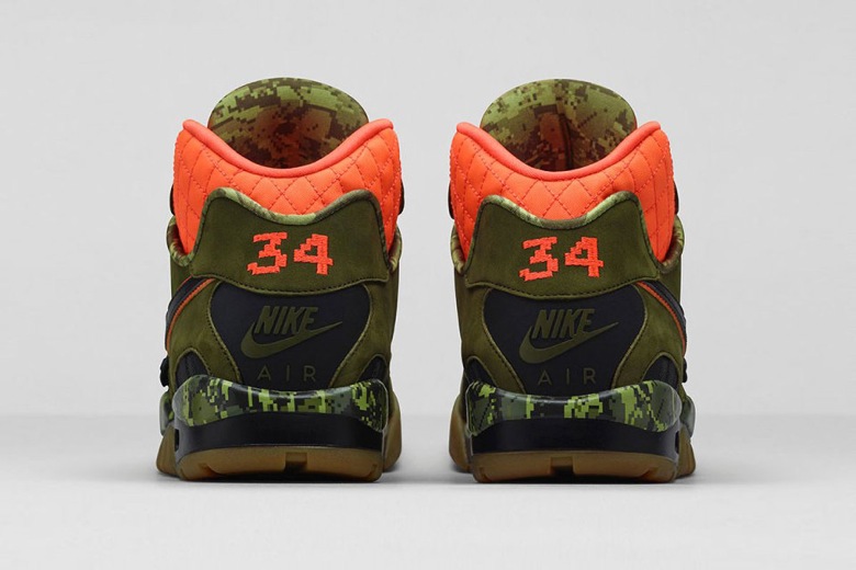C’est donc une Air Trainer SC II, l’un des modèles emblématiques porté par le sportif qui fait son retour sur ce thème. Le nubuck olive est censé rappeler la nature. Au niveau de la cheville, l’empiècement a été matelassé pour rappeler les vestes de chasse. Un camouflage a été ajouté au niveau de la semelle intermédiaire. Il est pixellisé, comme le 34 au talon, pour faire référence au jeu video 8-Bit Bo Jackson. Le choix du camo, ici un tiger camo, est un clin d’oeil aux tigres d’Auburn. La fameuse pub « Bo Knows » aurait finalement pu présenter le joueur pratiquant le tir à l’arc.