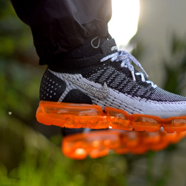 Ce motif « Safari » évoque notamment une autre sortie, le célèbre motif éponyme appliqué à l’Air Max 1 en collaboration avec atmos. À la manière d’un guépard, cet imprimé est ici appliqué sur le Swoosh latéral de manière très subtile tout comme sur le mini-Swoosh situé dans l’intérieur du pied lui faisant écho. Le jeu de lacets tacheté est un clin d’œil supplémentaire à la robe du félin. La fameuse bulle d’air à 360 degrés orange de la Vapormax renvoie elle aussi directement à cette thématique bestiale. L’empeigne est toujours proposée en Flyknit bicolore noir et blanc et se caractérise par un poids plume sur la balance et son confort. La chaussure est dotée de la technologie Flywire développée par Nike, caractérisée par des câbles sur le côté assurant un maintien du pied optimal. En complément, les designers ont apposé de nombreux détails réfléchissant la lumière en 3M disséminés sur la paire.